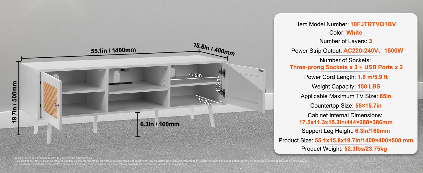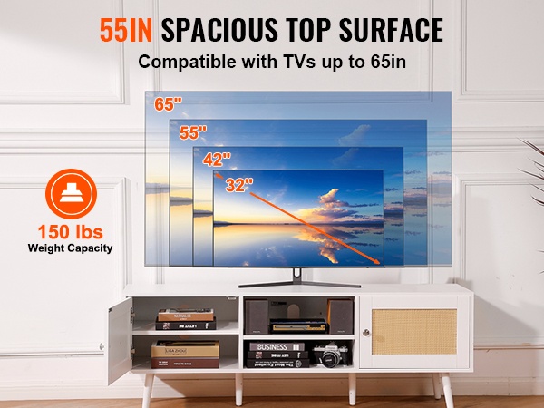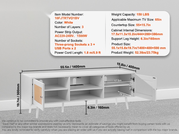 TV-tasossa on keskitasolle integroitu pistorasia ja USB-portit, joiden ansiosta televisio, mediatoistimet ja muut laitteet saa liitettyä kätevästi ilman näkyvää johtosotkua. Kannen koko on 55×15.7in, mikä sopii enintään 65in televisiolle ja kestää jopa 150 LBS painon. Jos tasoa ei käytetä televisiolle, se toimii mainiosti myös koriste-esineiden, kasvien tai kirjojen esillepanoon.