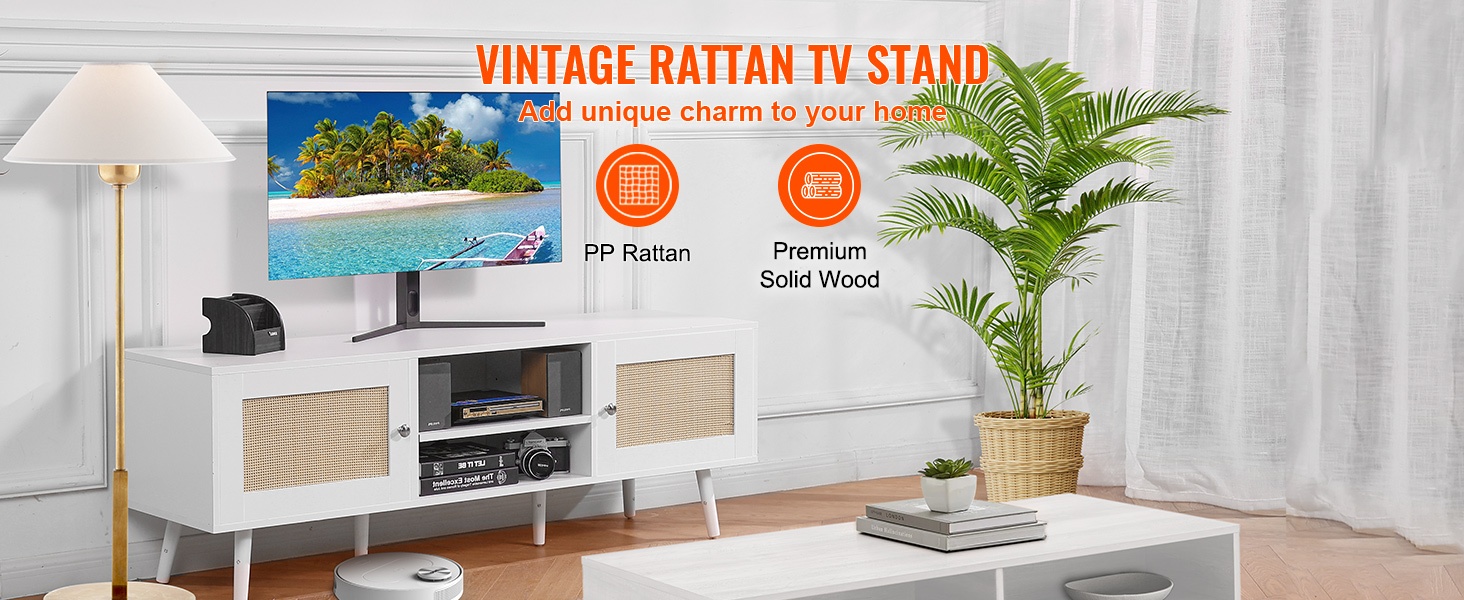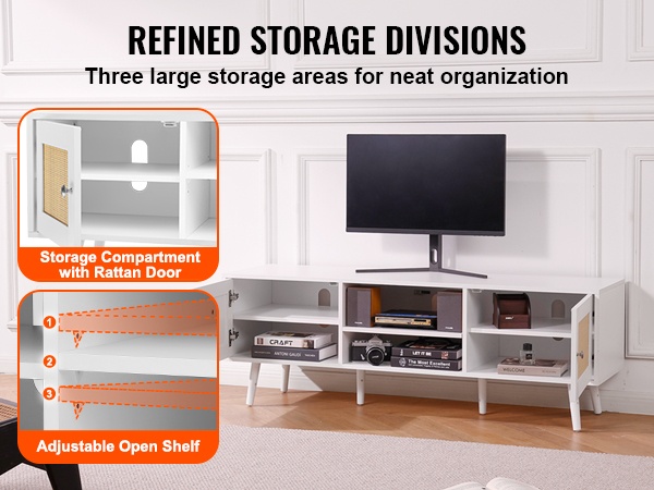 Sivuille sijoitetut tilavat rottinkikaapit tarjoavat suojaa ja järjestelmällistä säilytystilaa. Avoin keskihylly on korkeussäädettävä 0mm–64mm välillä, joten sinne mahtuvat esimerkiksi DVD- ja Blu-ray-soittimet, kaiuttimet, pelikonsoleiden telakat, CD-levyt ja kirjat. Takana olevat kolme läpivientireikää pitävät johdot siististi piilossa.