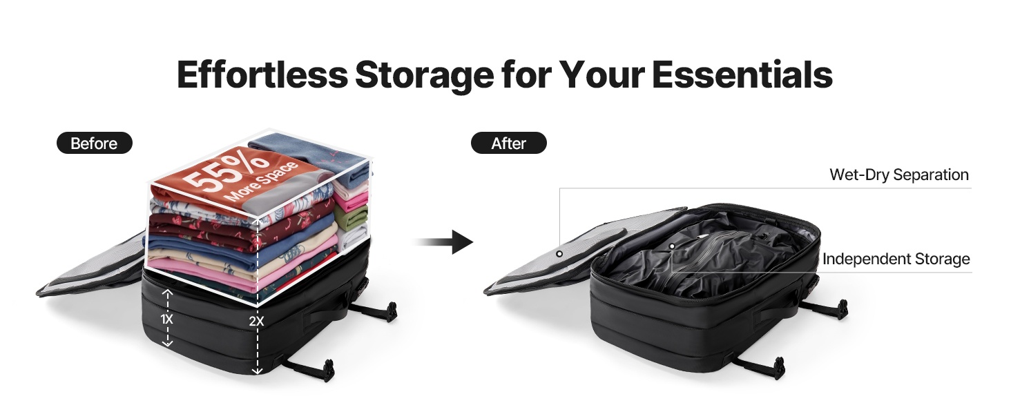Tyhjiökompression avulla repun tilavuus mukautuu eri matkatarpeisiin. Voit puristaa vaatteet kasaan, kun haluat maksimoida säilytystilan, tai käyttää reppua väljemmin lyhyillä matkoilla. Näin sama reppu sopii sekä käsimatkatavaraksi että pidemmille reissuille.