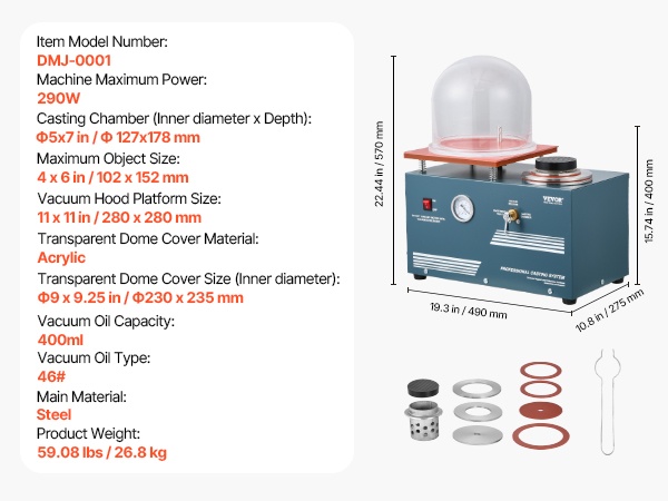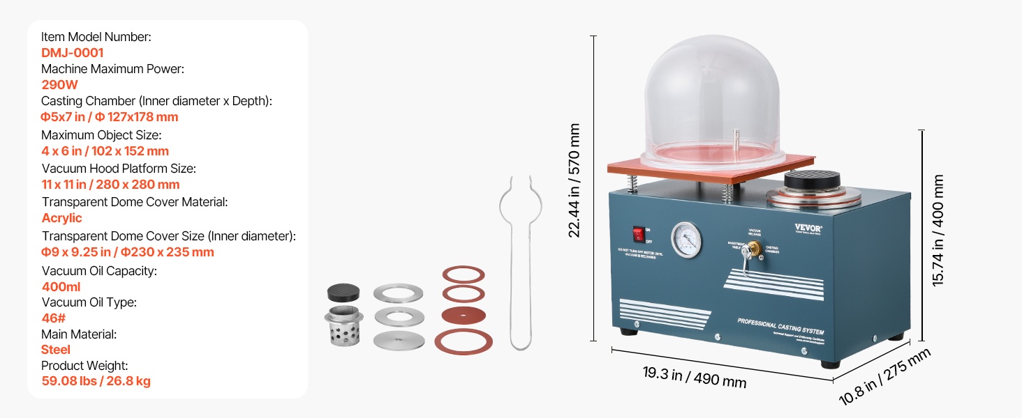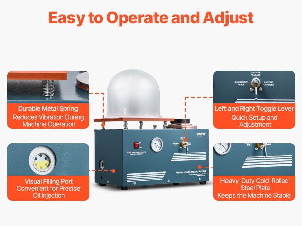 Laitteen suuri tyhjiökammio ja nopea tyhjiöinti tukevat tehokasta ja tarkkaa valuprosessia. Päivitetty öljyntäyttöaukko helpottaa tyhjiööljyn lisäämistä, ja tarkka painemittari auttaa seuraamaan tyhjiön tasoa prosessin aikana.