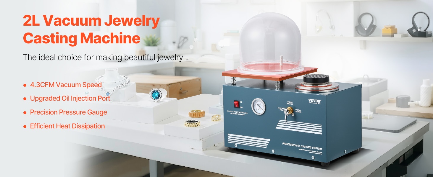 Tyhjiövalukone jalometalleille yhdistää suuren kammion, nopean tyhjiönopeuden ja selkeän painemittarin. Laite soveltuu valumuottien valmistukseen esimerkiksi korujen ja pienten metalliosien tuotannossa, kun halutaan vähentää ilmakuplia ja parantaa valun laatua.