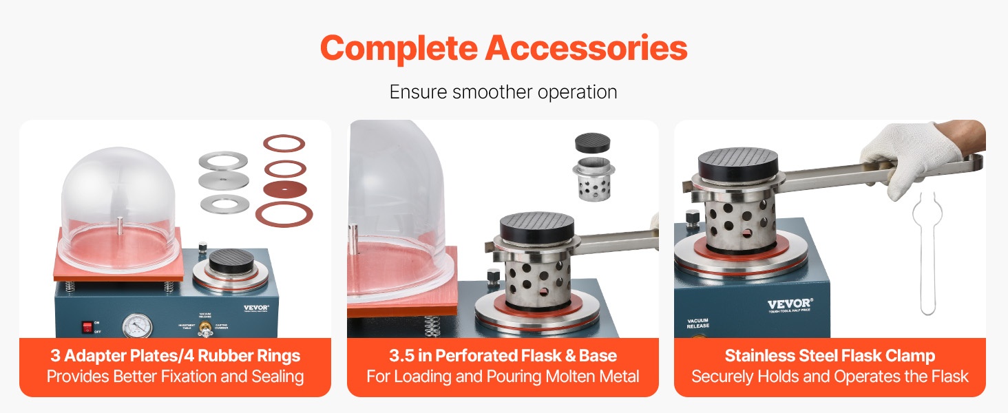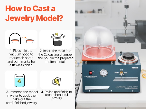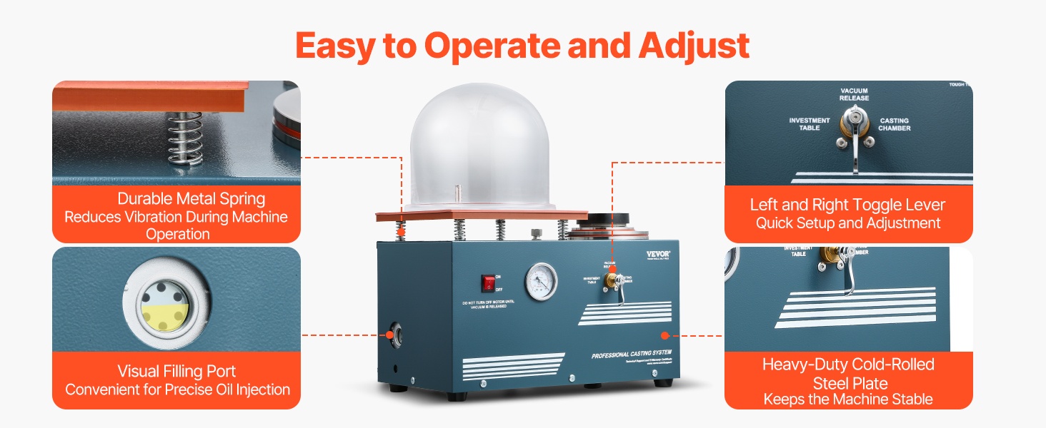 Tyhjiövalukone on suunniteltu helpoksi käyttää, joten sekä aloittelijat että kokeneemmat käyttäjät pääsevät nopeasti alkuun. Selkeä ohjauspaneeli tukee tasaisen prosessin hallintaa ja laadukkaiden koruvalumuottien valmistusta.