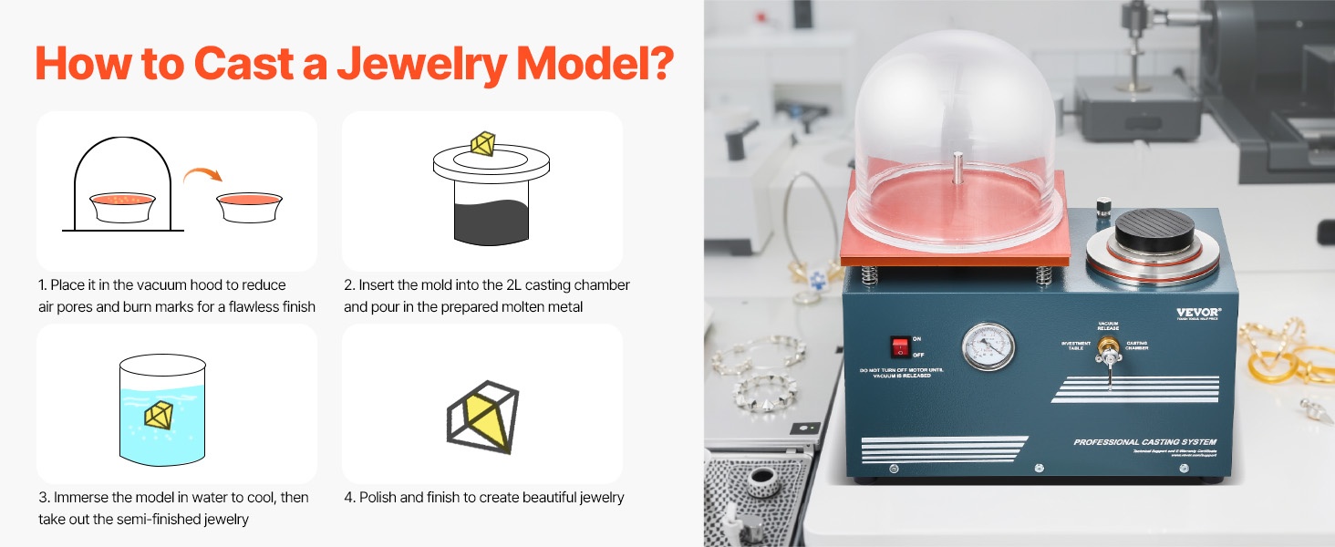 Valukone soveltuu monenlaisiin koruvalusovelluksiin, kuten sormusten, kaulakorujen ja korvakorujen valuihin. Tehokas tyhjiöjärjestelmä auttaa vähentämään ilmakuplia ja valuvikoja, jotta muoteista saadaan tasalaatuisia.