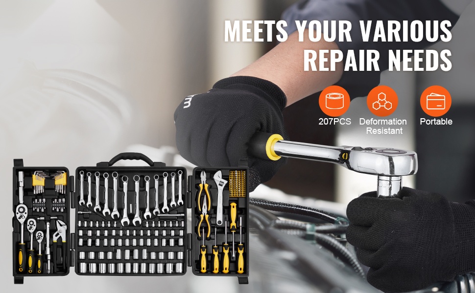 Monipuolinen 207-osainen mekaanikon työkalusarja helpottaa autojen huoltoa ja monia kodin ja verstaiden korjaustöitä. Kovat teräsosat, selkeästi merkityt hylsyt ja käytännöllinen säilytyslaukku pitävät työkalut järjestyksessä ja valmiina käyttöön.