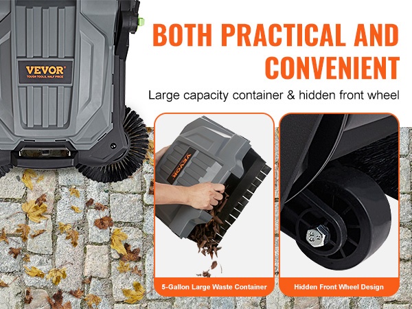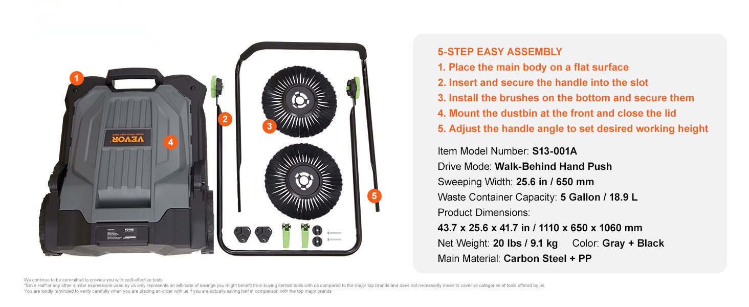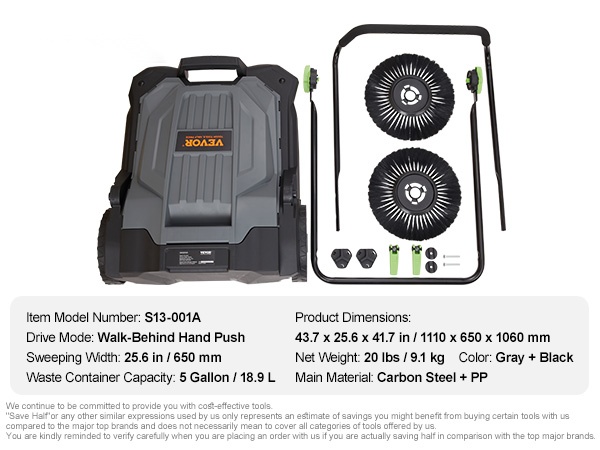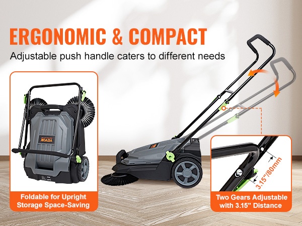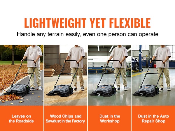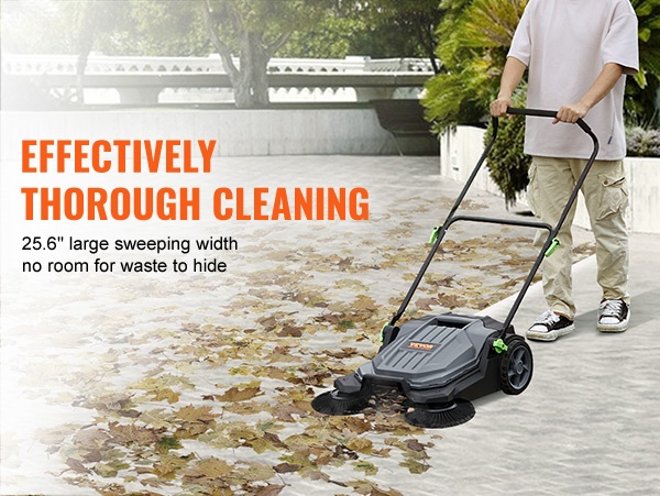 Työnnettävä lattianlakaisukone toimii täysin ilman sähköä tai polttoainetta. Sen 25.6" / 650 mm lakaisuleveys ja 5 gallon / 18.9 L roskasäiliö mahdollistavat tehokkaan puhdistuksen. Säädettävä ja taitettava työntöaisa helpottaa työskentelyä ja säilytystä ja tarjoaa tasaisen, luotettavan lakaisutuloksen.