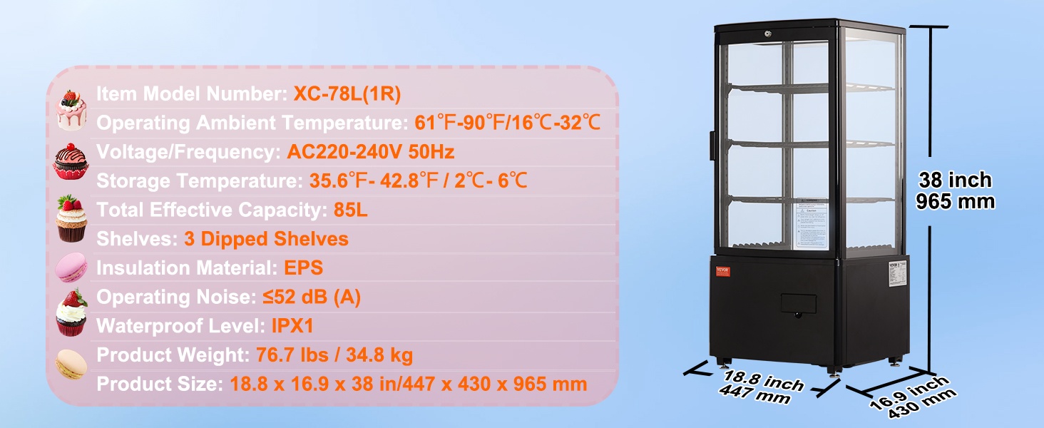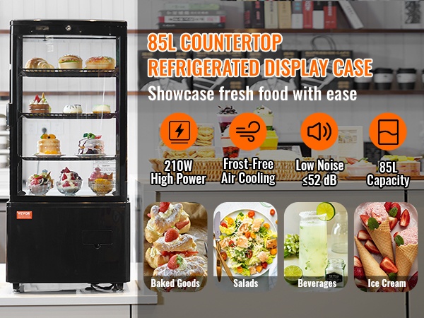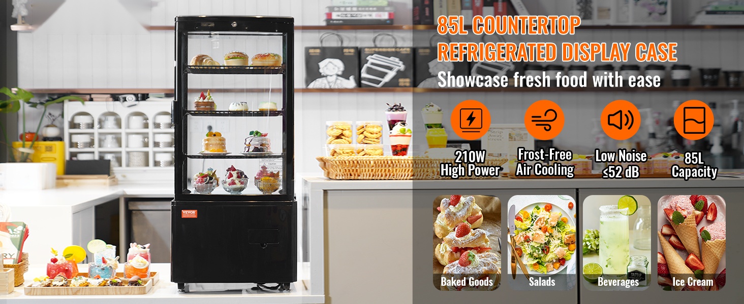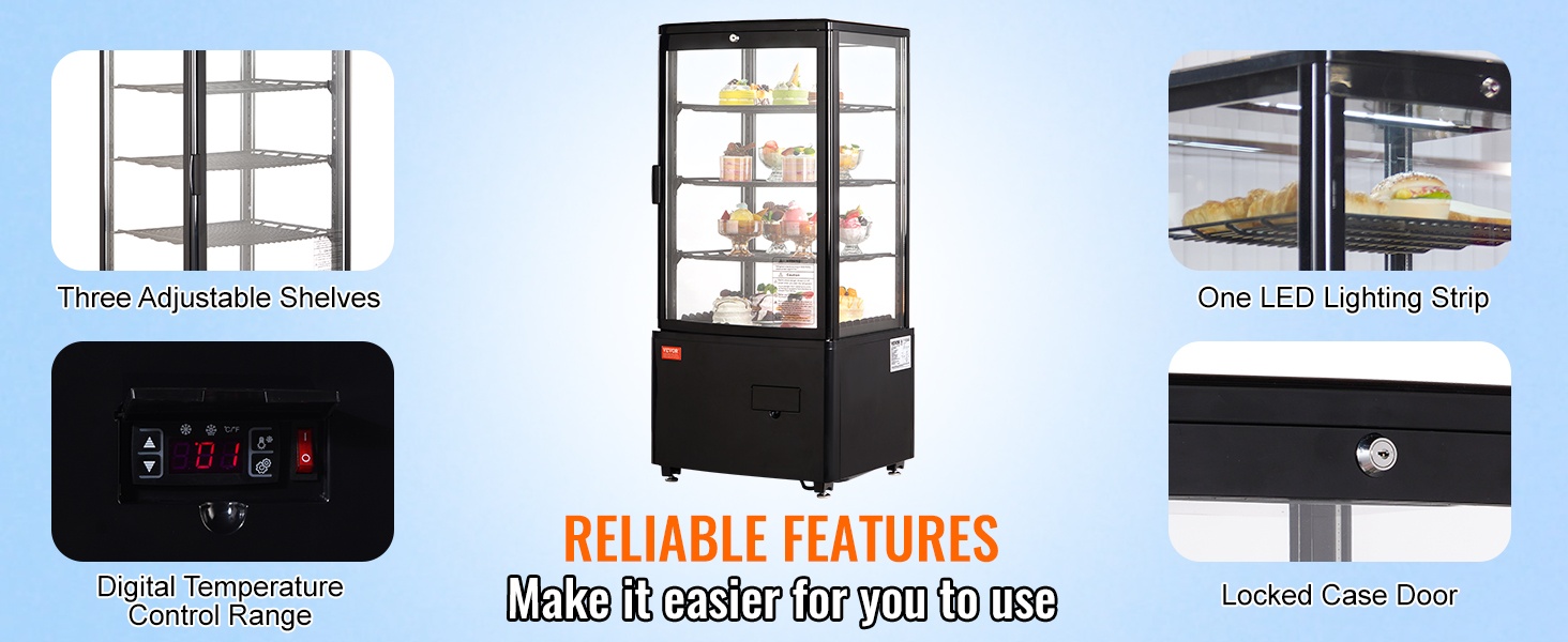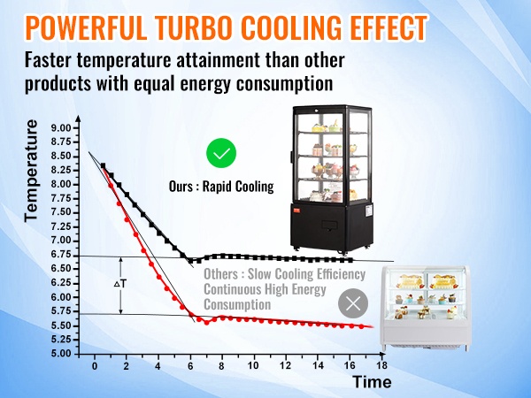 Turbojäähdytystekniikka viilentää vitriinin nopeasti miellyttävään 35.6–42.8℉ (2–6℃) lämpötilaan. Ilmakylmennys jakaa kylmän ilman tasaisesti, mikä auttaa pitämään tuotteet raikkaina ja oikeassa tarjoilulämpötilassa.
