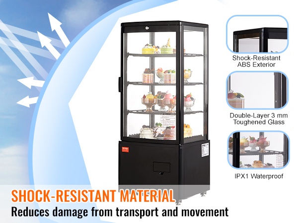 Kestävä ABS-kuori ja kaksinkertainen karkaistu lasi suojaavat vitriiniä päivittäisessä käytössä. Rakenne on suunniteltu kestämään kolhuja ja tärähdyksiä esimerkiksi kahviloissa, leipomoissa ja myymälöissä.