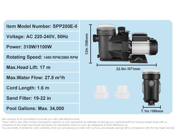 - Maksimivirtaama jopa 27800 L/H (suurempi nopeus), riittävä myös isommille maauima-altaille.