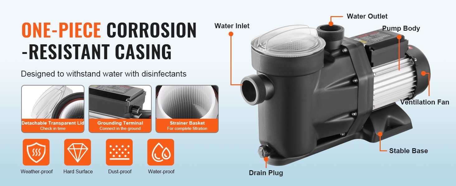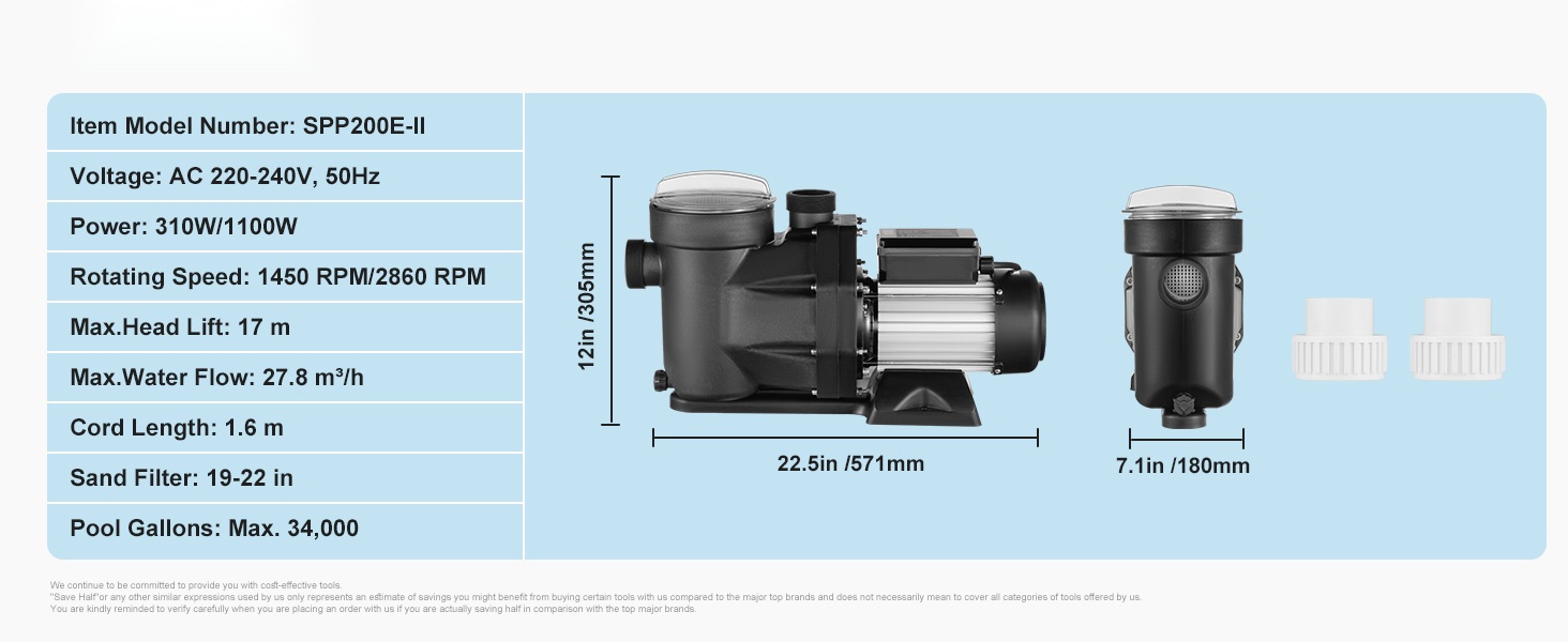 Tehokas kaksinopeuksinen uima-allaspumppu maauima-altaisiin. Pumppu kierrättää ja suodattaa veden luotettavasti, soveltuu sekä tavallisiin maauima-altaisiin että esimerkiksi porealtaisiin ja kylpytynnyreihin (myös suolavesialtaisiin), kunhan järjestelmä on yhteensopiva.