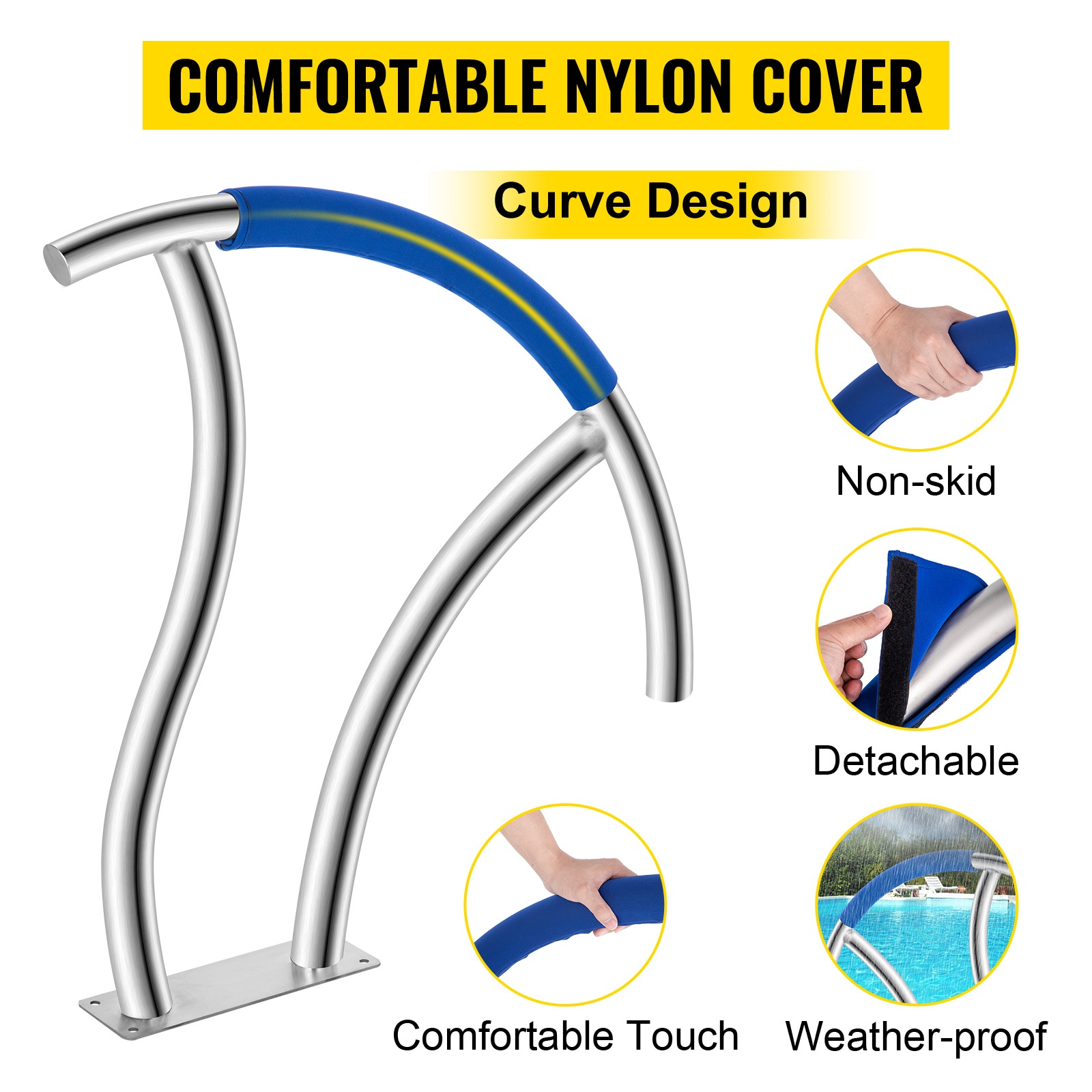 Ruostumattomasta teräksestä valmistettu uima-altaan porraskaide helpottaa ja turvaa altaaseen kulkemista ja sieltä poistumista. Kaiteessa on irrotettava, noin 1.6 ft / 50 cm pitkä sininen nylon-päällys, joka parantaa pitoa ja käyttömukavuutta. Kaide on helppo asentaa mukana tulevien itseporautuvien ruuvien ja poranterän avulla.