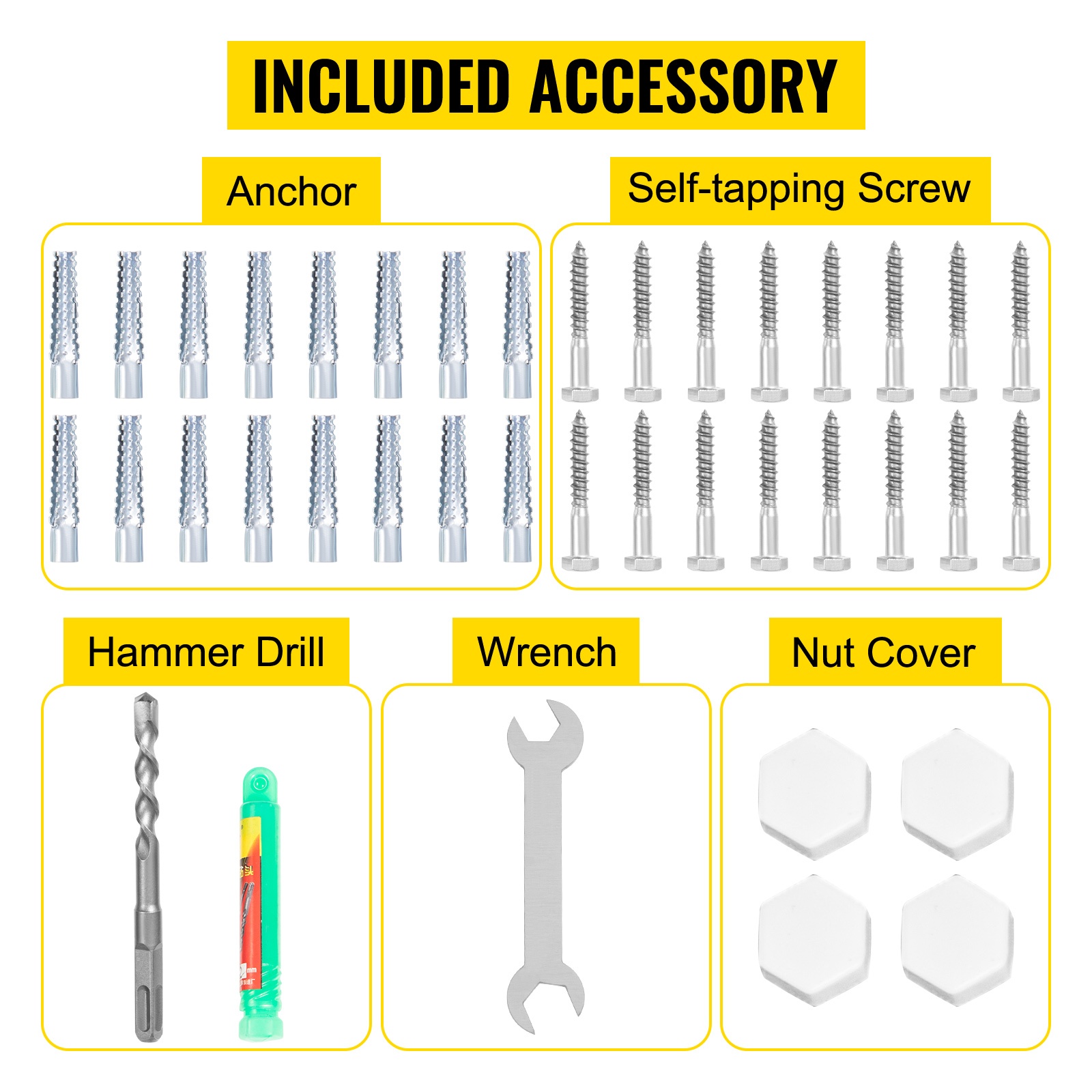 Pakkaukseen sisältyy kaikki perusasennukseen tarvittava: poranterä, jakoavain, ankkurit, itseporautuvat ruuvit, suojamutterikannet sekä nylon-ote.