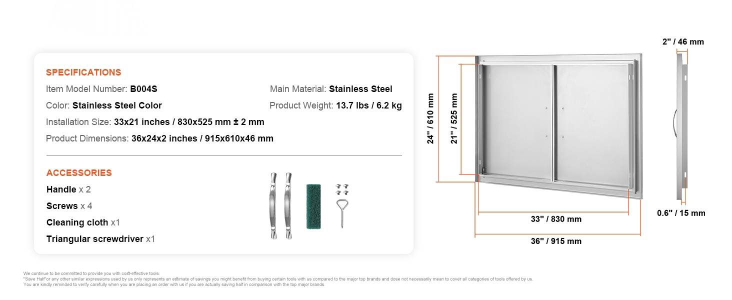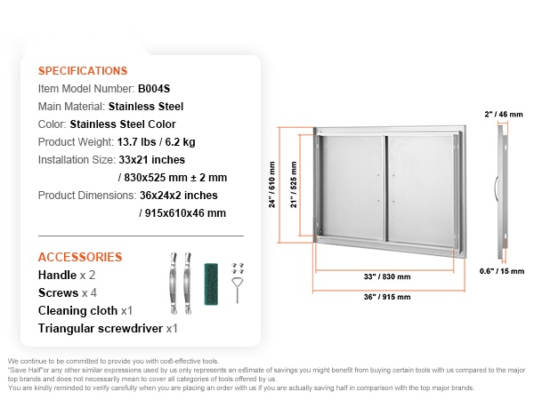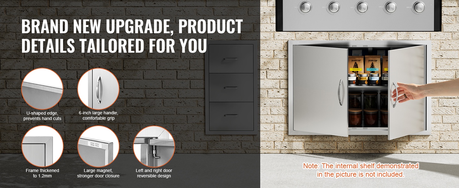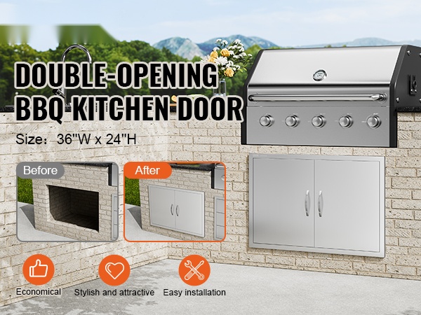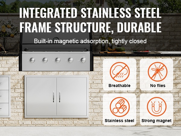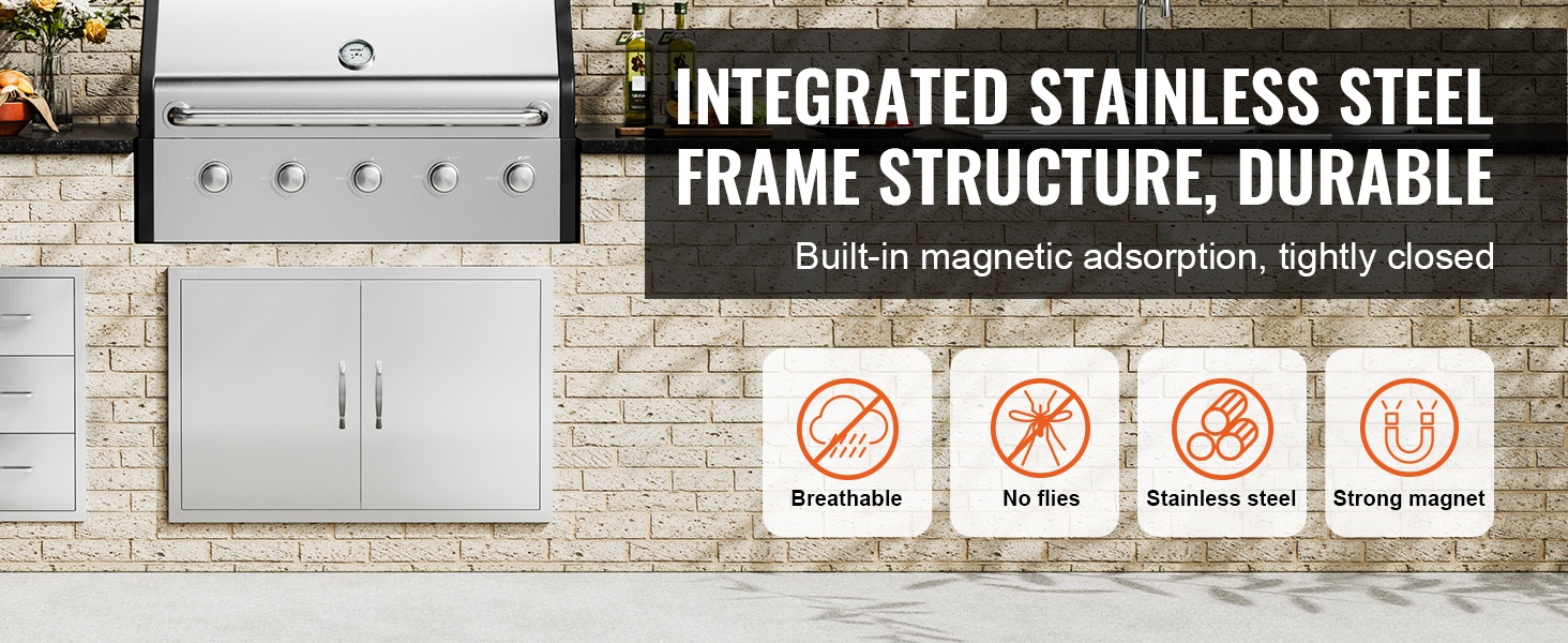 Tämä BBQ- ja ulkokeittiöovi on valmistettu tukevasta, korkealaatuisesta ruostumattomasta teräksestä. Materiaali on ruostumaton, vedenpitävä ja naarmuankestävä, ja sileä pinta on helppo pyyhkiä puhtaaksi ilman jälkiä tai tahroja. Saumaton rakenne ja terävien kulmien puuttuminen lisäävät käyttöturvallisuutta.