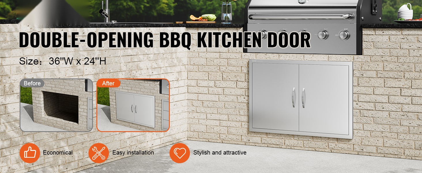 Kaksiosainen ulkokeittiön ovi tarjoaa tarkan asennuskoon ja kestävän rakenteen grilli- ja säilytystiloihin. Ruostumattomasta teräksestä valmistettu pinta kestää sääolosuhteita ja on helppo pitää puhtaana.