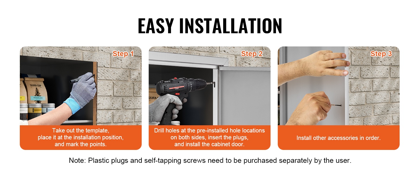 Pakkauksen ulkopintaan on painettu 1:1-asennusmalli (CAD-piirros). Voit asettaa mallin siihen kohtaan, johon ovi halutaan asentaa, ja tehdä aukon piirroksen viivoja seuraamalla. Tämä helpottaa oikean kokoisen ja muotoisen aukon tekemistä esimerkiksi ulkokeittiömoduuliin tai kaappirakenteeseen.