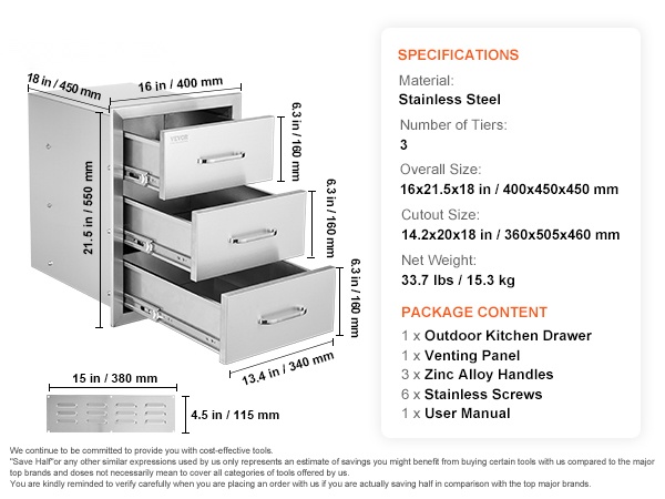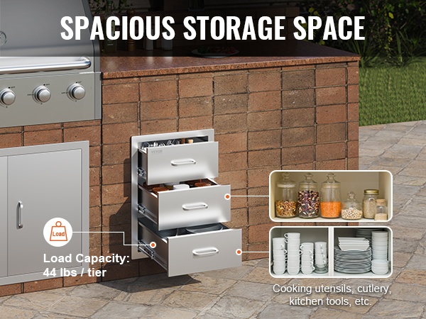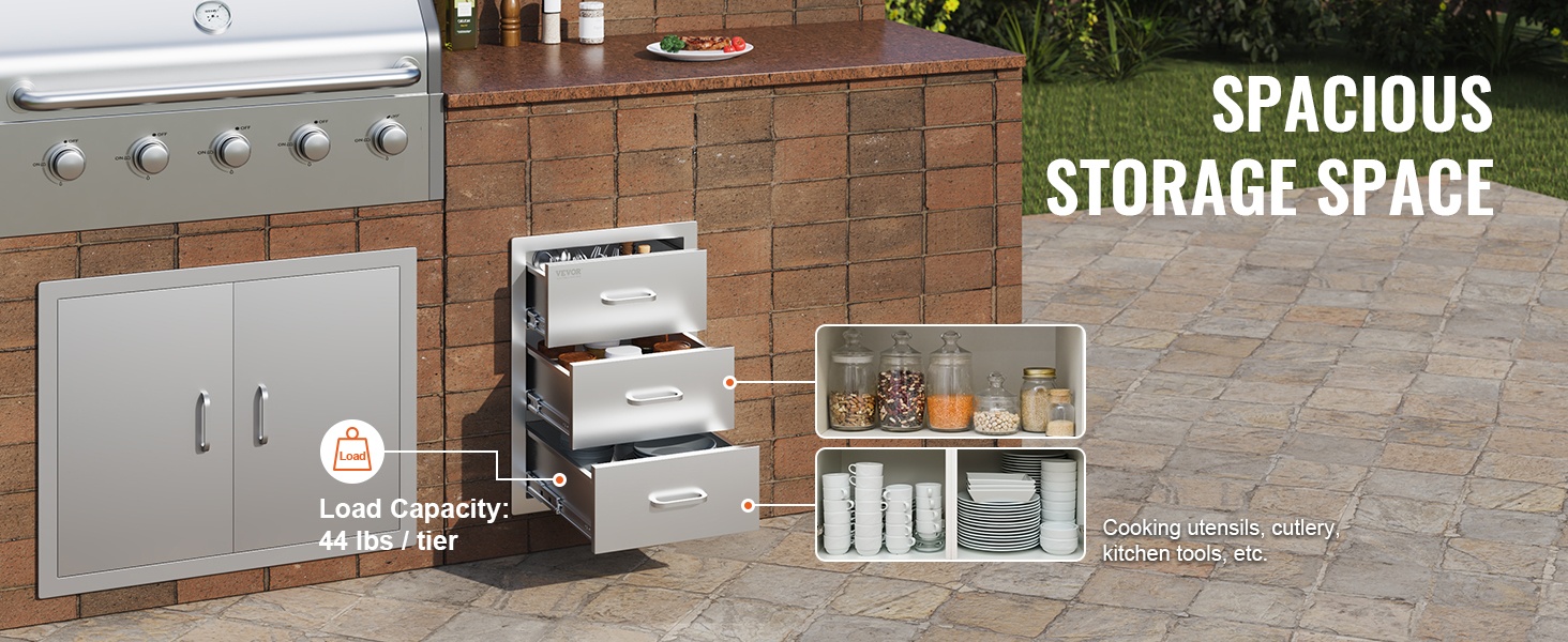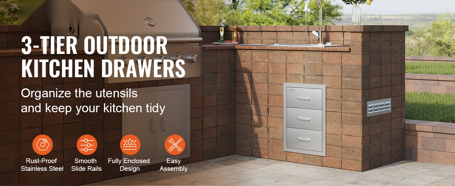 Tämä kolmiosainen ulkokeittiön laatikkoyksikkö tarjoaa runsaasti tilaa grilleihin ja ulkokeittiöön liittyvien tarvikkeiden säilytykseen. Laatikoihin mahtuvat esimerkiksi työvälineet, astiat, mausteet ja muut usein tarvittavat tarvikkeet, jolloin ulkokeittiö pysyy siistinä ja tavarat helposti saatavilla.