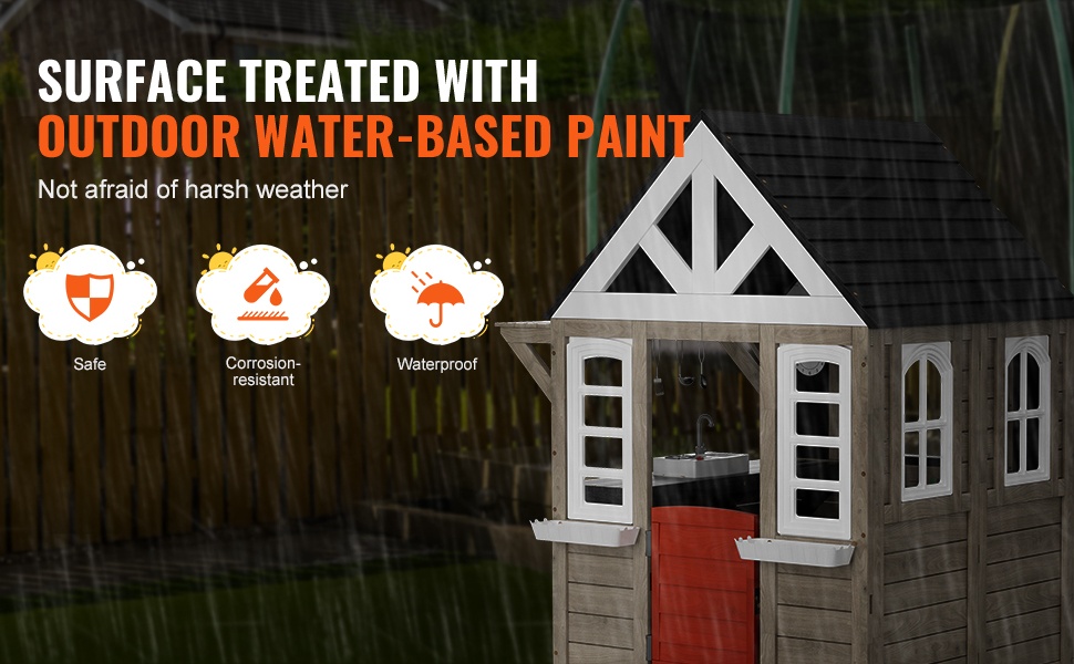 Leikkimökin pinta on käsitelty vesiohenteisella maalilla, joka sisältää UV-suojan ja homeenkestävyyden. Näin mökki kestää paremmin vaihtelevia sääolosuhteita ulkokäytössä.
