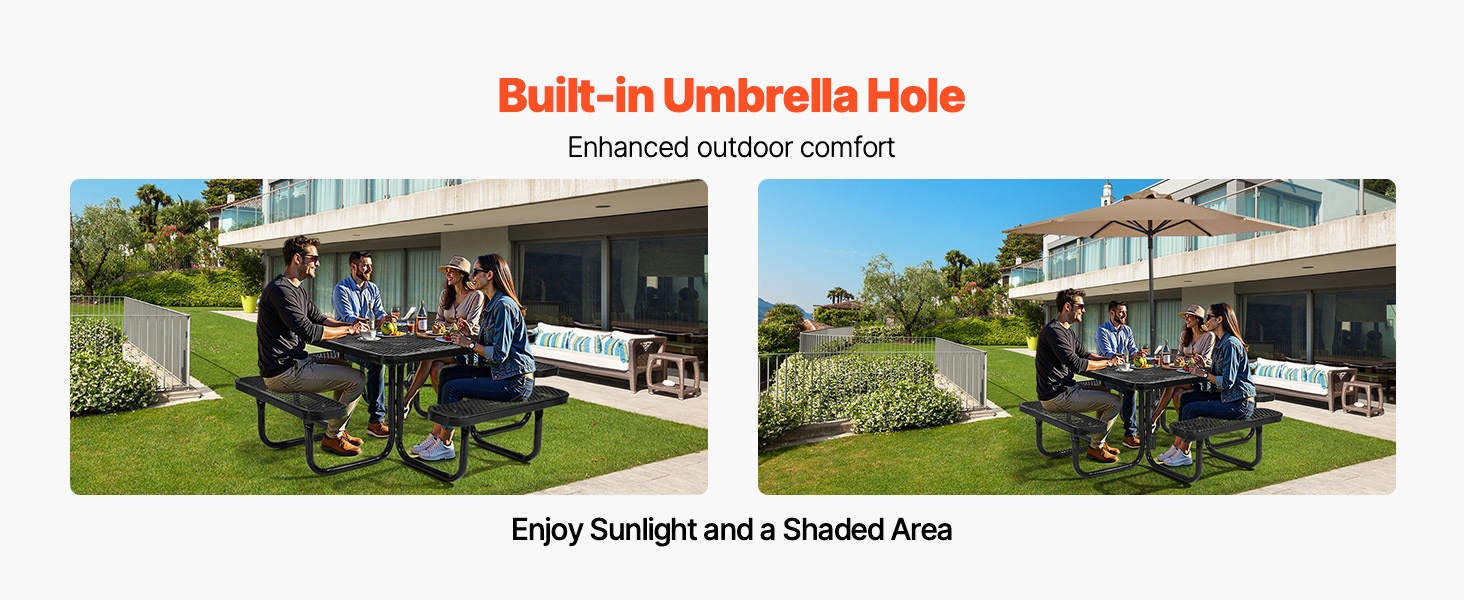 Pöydän kannessa on valmiiksi tehty reikä aurinkovarjolle. Kun varjoa ei tarvita, voit nauttia auringosta vapaasti. Kuumalla tai arvaamattomalla säällä varjon saa nopeasti paikalleen luomaan varjoisan ja miellyttävän oleskelupaikan.