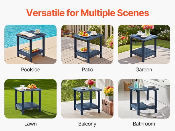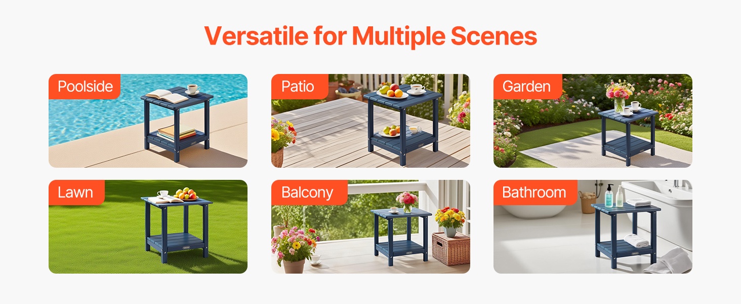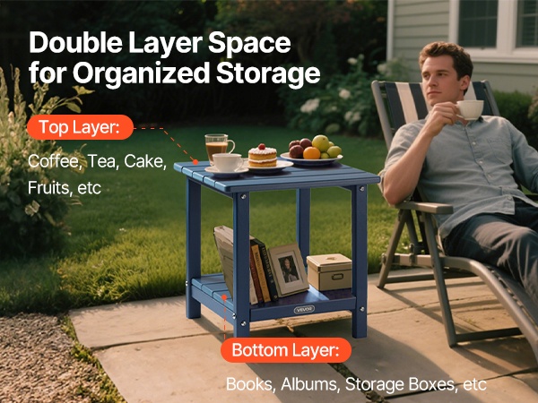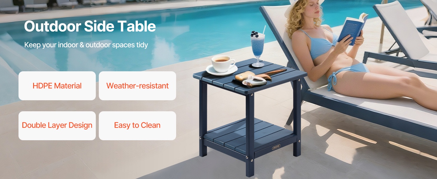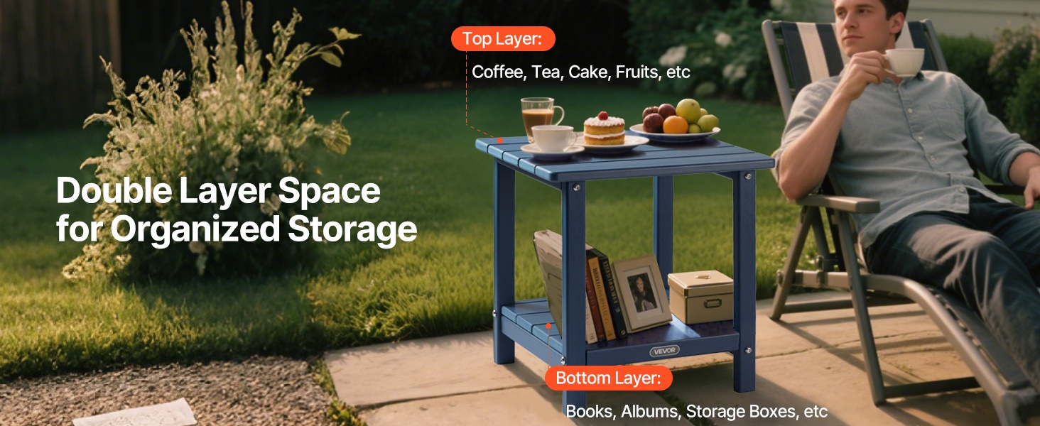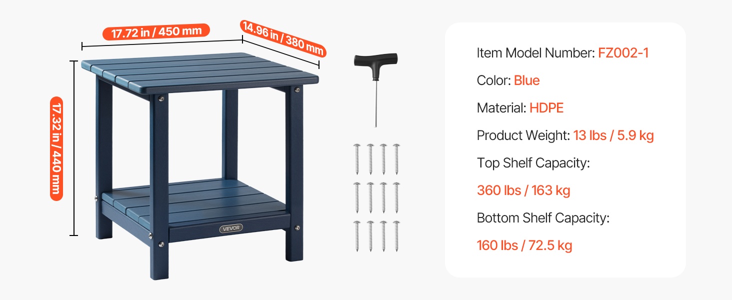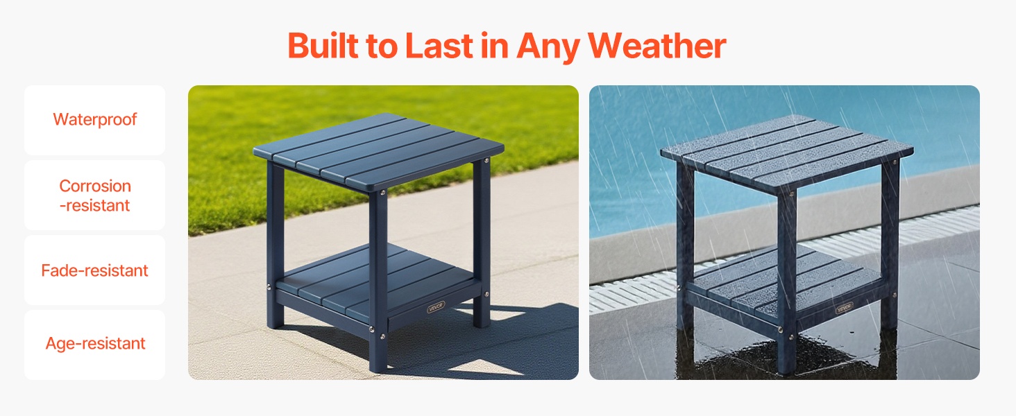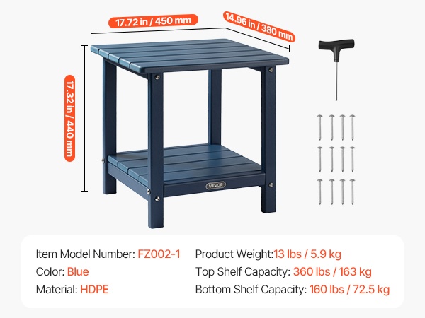 Pöytä on valmistettu laadukkaasta HDPE-muovista ja siinä on tukeva H-muotoinen runkorakenne. Ylälevy kestää enintään 360 lbs / 163 kg ja alataso enintään 160 lbs / 72.5 kg, joten pöytä soveltuu hyvin sekä koriste-esineille että käytännölliseen säilytykseen.