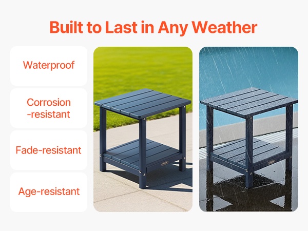 Tämä ulkokäyttöön suunniteltu sivupöytä kestää hyvin vaihtelevia sääolosuhteita. Se on vesitiivis, kosteutta hylkivä ja värinsä pitävä. Kaksitasoinen rakenne tarjoaa lisäsäilytystilaa ja auttaa pitämään ympäristön siistinä sekä järjestyksessä.