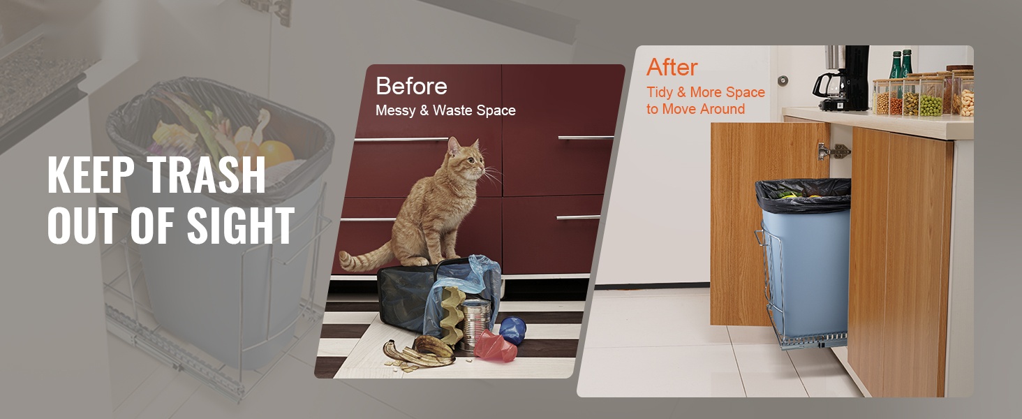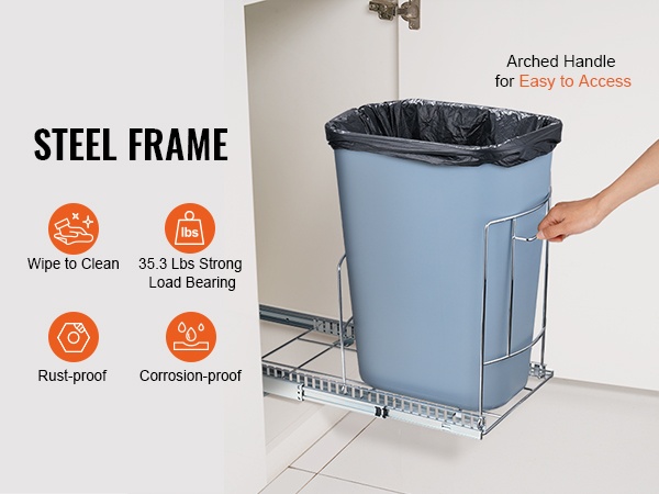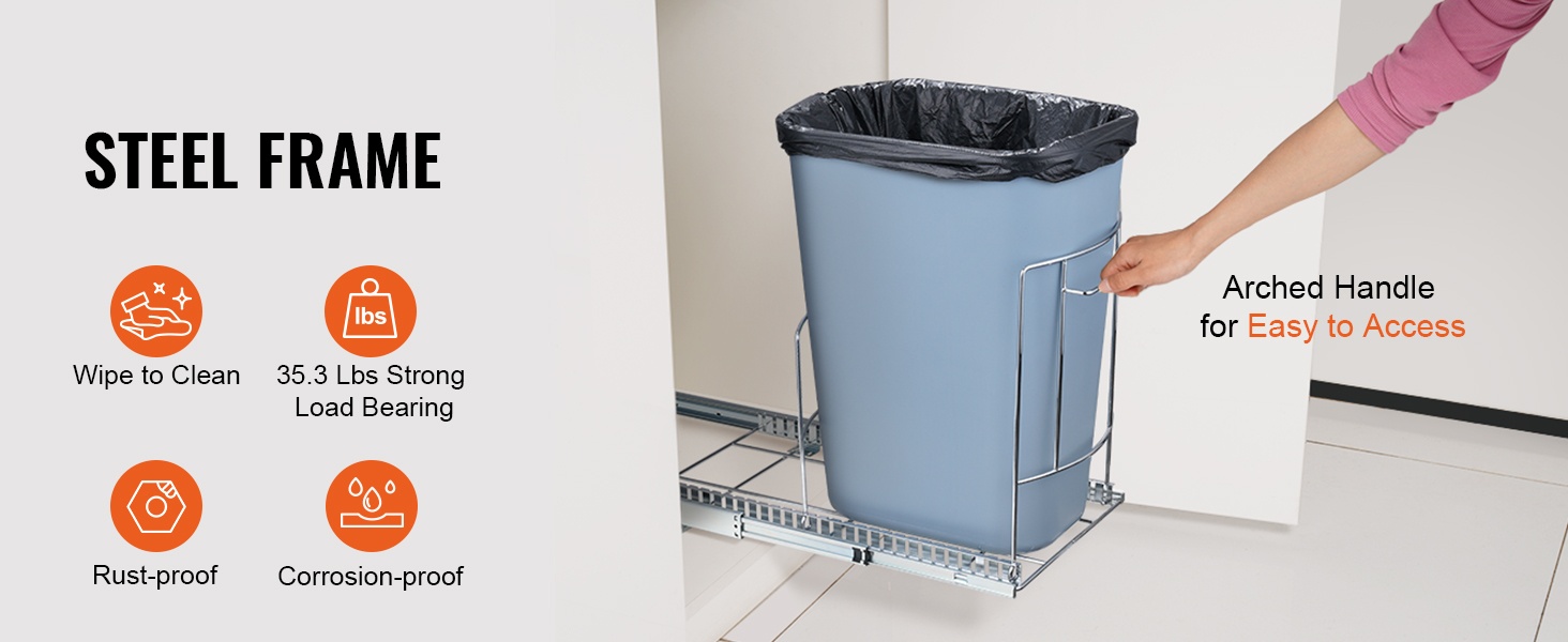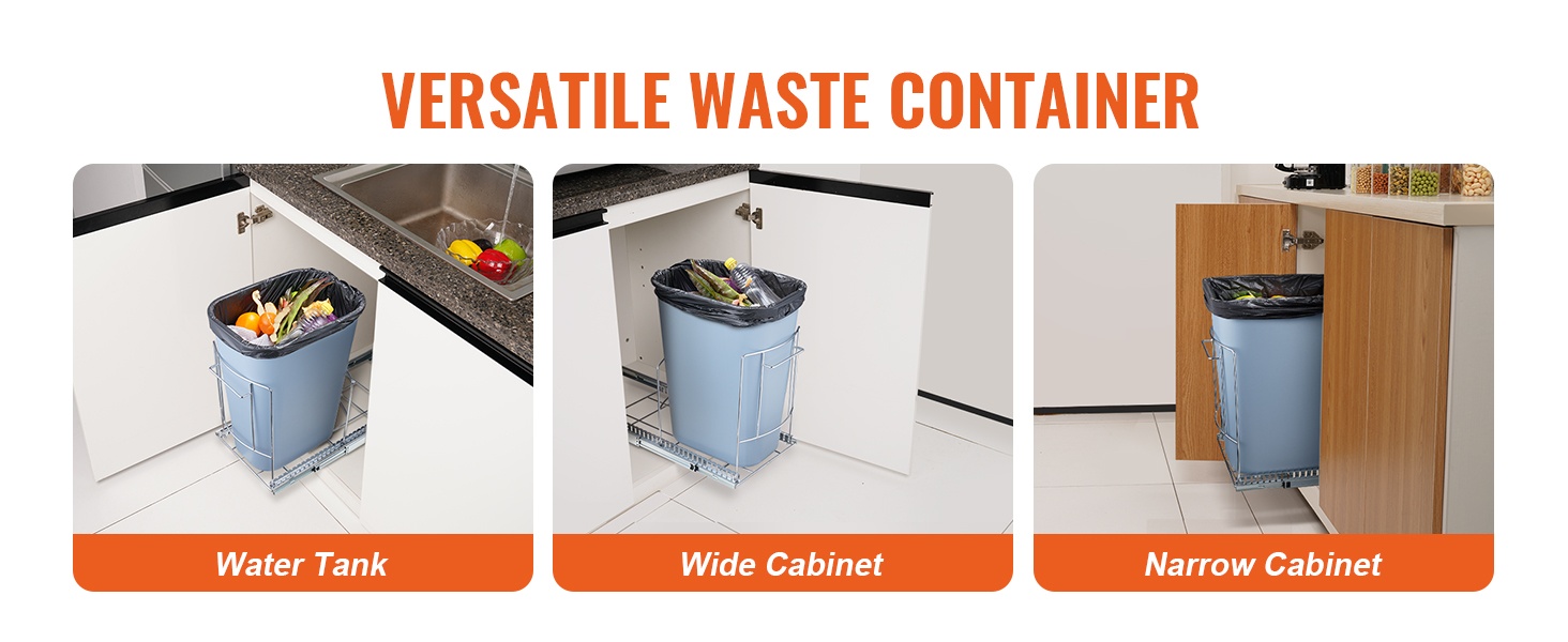 Alakaappiin asennettava ulosvedettävä jäteastia-alusta sopii peruskaappeihin, ja auttaa hyödyntämään kaapintilan tehokkaasti. Se pitää roskat poissa näkyvistä ja helpottaa työskentelytasojen siistinä pitämistä.