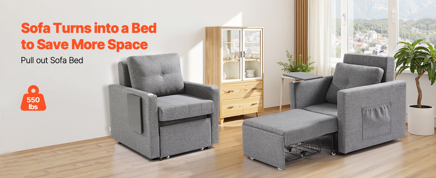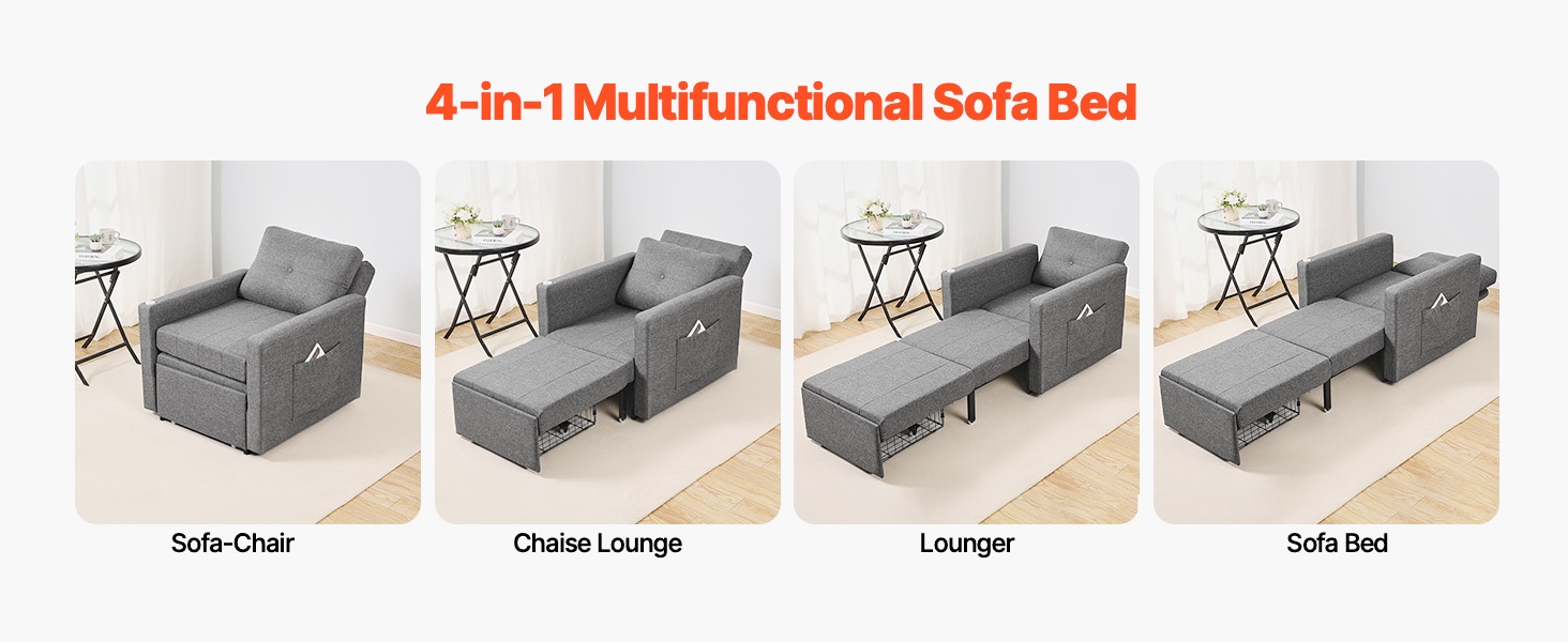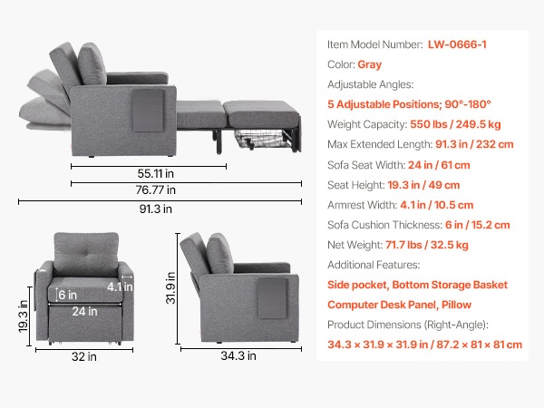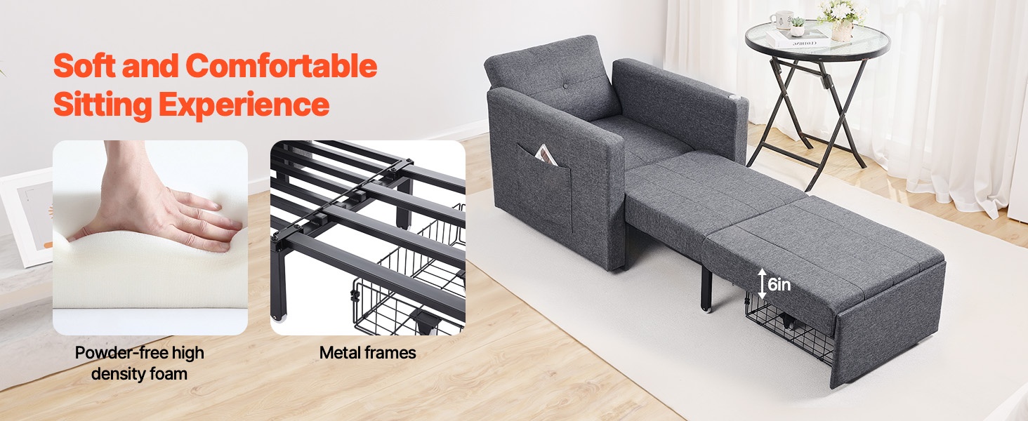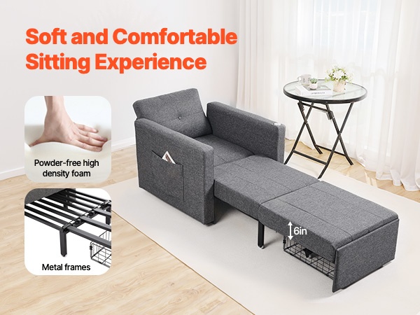 Vankka metallirunko kestää jopa 550 lbs / 249.5 kg. Istuimessa on painumaton, tiheä vaahtotäyte ja hengittävä pellavakangasverhoilu, jotka yhdessä tarjoavat mukavan ja kestävän istuin- ja nukkumismukavuuden.