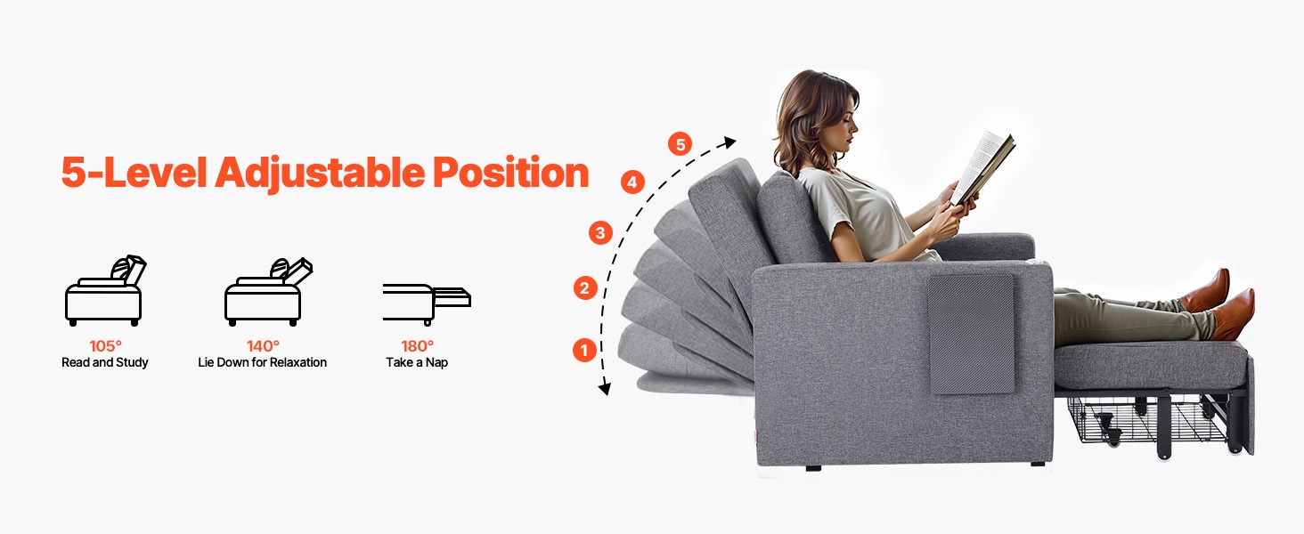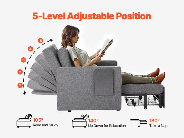 Selkänoja voidaan säätää 5 eri asentoon välillä 90°–180°, joten löydät sopivan asennon istumiseen, rentoutumiseen ja nukkumiseen.