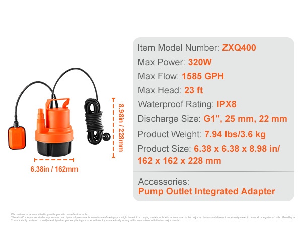 - Maksimivirtaus: 2510 GPH (9500 L/H) nopeaan vedenpoistoon