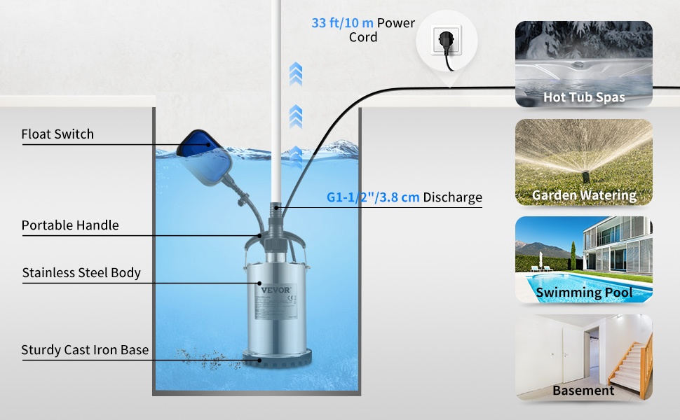 Ruostumattomasta teräksestä valmistettu kotelo kestää hyvin korroosiota ja mekaanista kulutusta. IPX8-suojaus mahdollistaa jatkuvan käytön veden alla. Pumppu soveltuu erityisesti puhtaan tai lievästi samean veden siirtämiseen uima-altaista, porealtaista, vesialtaista, kellareista ja muista tulvivista tiloista sekä kasteluun.