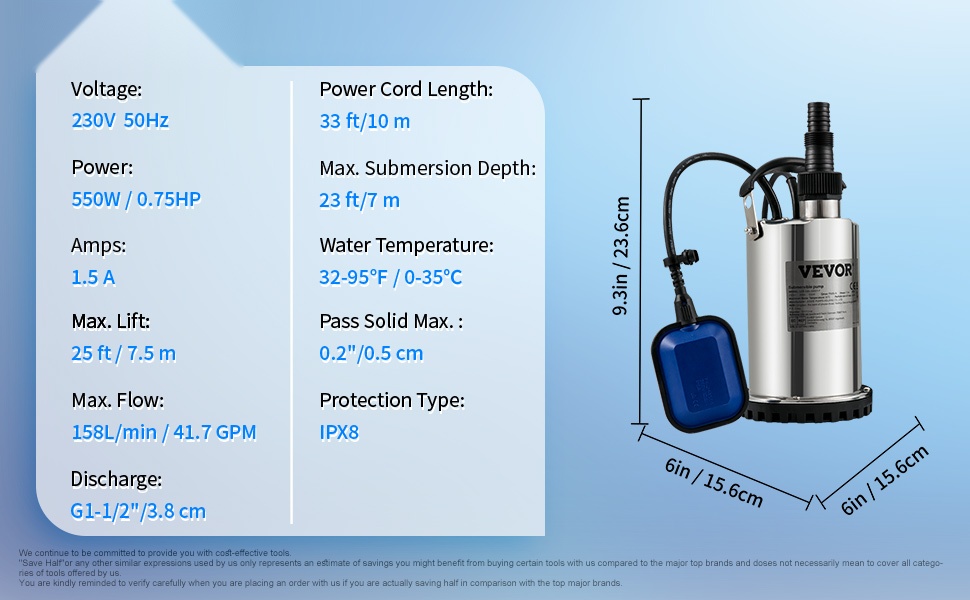 550W / 0.75HP kuparimoottori tarjoaa tasaisen tyhjennystehon ja kestää pitkäaikaista käyttöä. Pumppu on suunniteltu hiljaiseen käyntiin ja siinä on lämpösuoja, joka auttaa ehkäisemään ylikuumenemista. Enimmäisvirtaus on 41.7 GPM / 158 L/min ja enimmäisnostokorkeus 25 ft / 7.5 m.