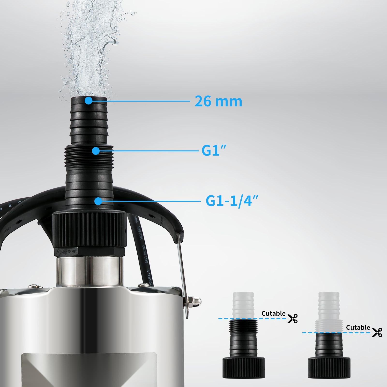 Mukana tuleva poistoadapteri voidaan leikata eri halkaisijoihin, jotta se sopii eri kokoisiin letkuihin. Näin sama pumppu voidaan liittää helposti erilaisiin viemäröinti- ja kastelujärjestelmiin ilman erillisiä liitososia.