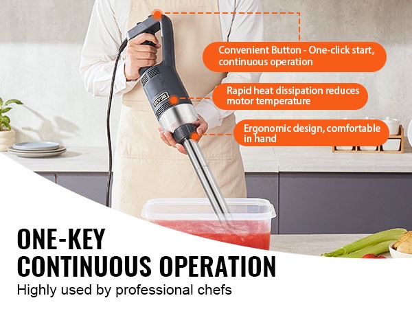 Raskaan käytön upposekoitin on varustettu laadukkaalla moottorilla, joka tarjoaa vahvan väännön ja alhaisen melutason. Säädettävän nopeuden ansiosta voit sovittaa tehon tarkasti eri sekoitustehtäviin, ja yhdellä painalluksella saat aikaan nopeasti tasaisen lopputuloksen.
