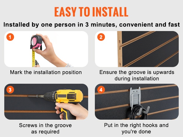 Asennus on suoraviivainen, eikä vaadi erikoistyökaluja. Kun paneelit ovat paikoillaan, seinä muuttuu monikäyttöiseksi säilytyspinnaksi esimerkiksi työkaluille, tarvikelaatikoille, pelitarvikkeille tai käsityömateriaaleille.