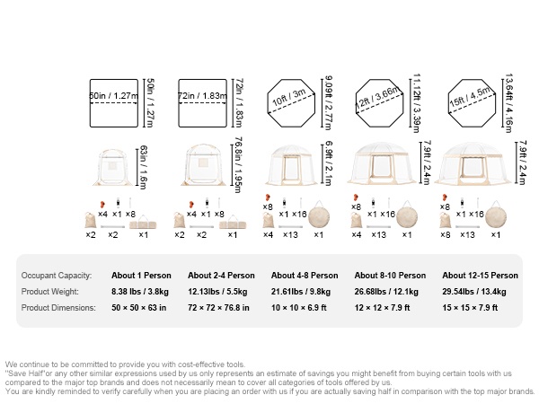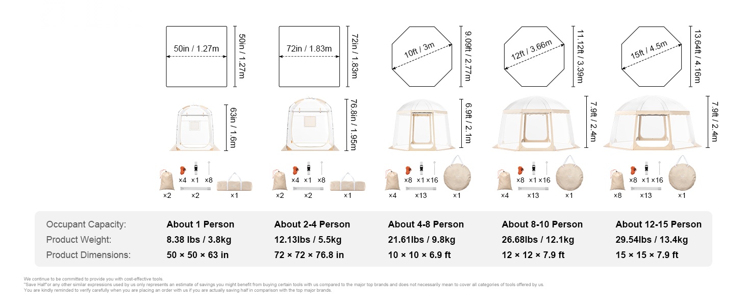 - Tilava: mitat 10 x 10 x 6.9 ft / 3 x 3 x 2.1 m, kapasiteetti noin 4–8 henkilöä.