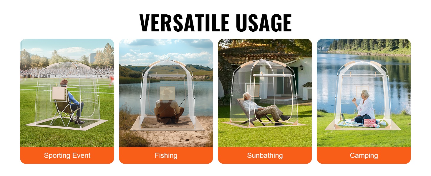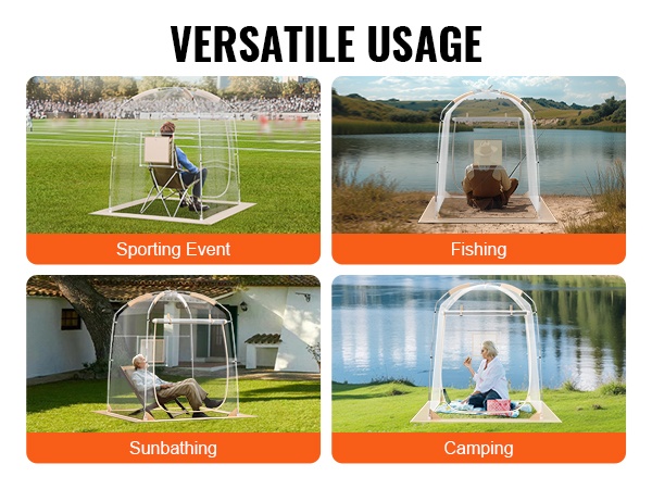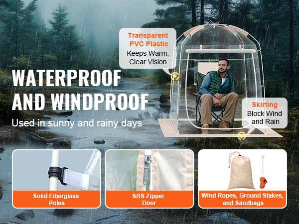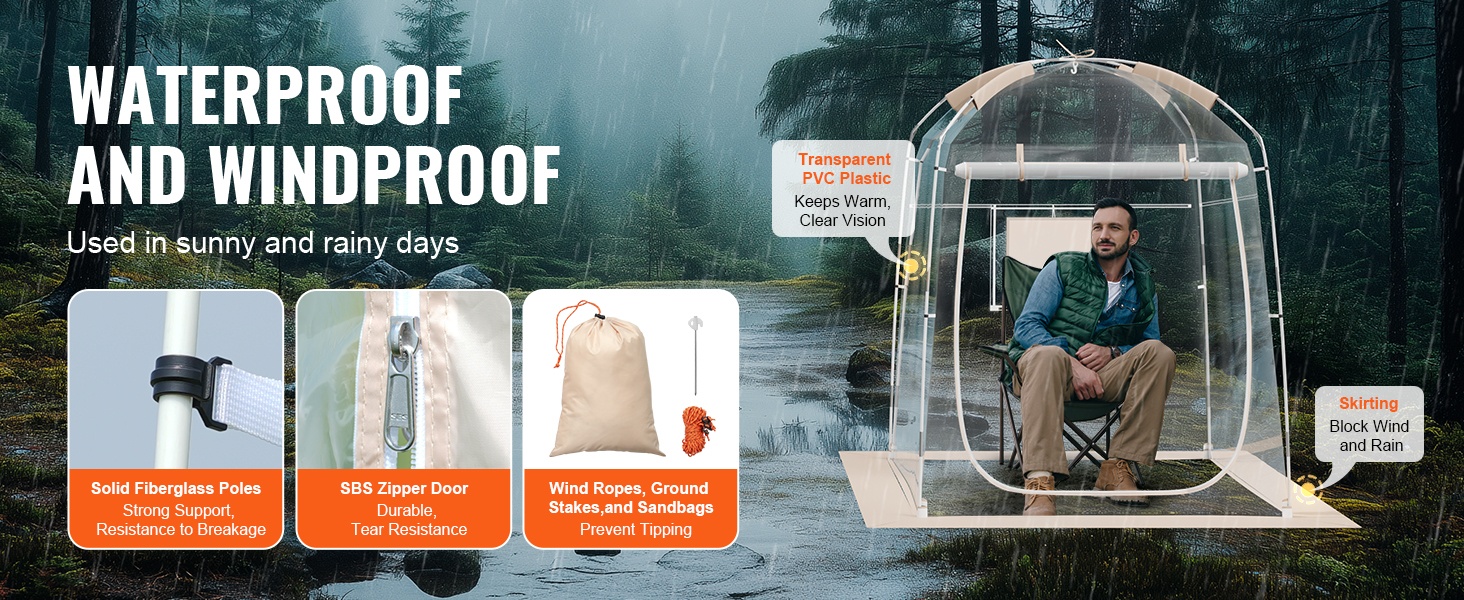 Teltta on valmistettu repeämistä kestävästä, läpinäkyvästä PVC-materiaalista, joka pitää sinut lämpimänä ja kuivana. Vedenpitävä rakenne ja tukeva runko kestävät hyvin tuulta, joten voit keskittyä tapahtumaan ilman huolta säästä.