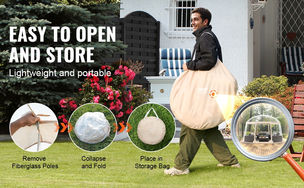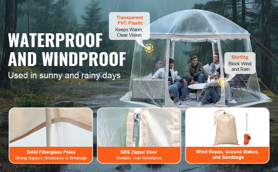 Teltta on valmistettu repeämistä kestävästä, läpinäkyvästä PVC-materiaalista, joka pitää sinut lämpimänä ja kuivana. Vesitiivis rakenne ja jämäkkä runko kestävät tuulta, jotta voit keskittyä tapahtuman seuraamiseen ilman huolta säästä.