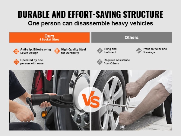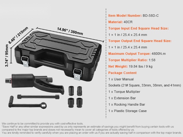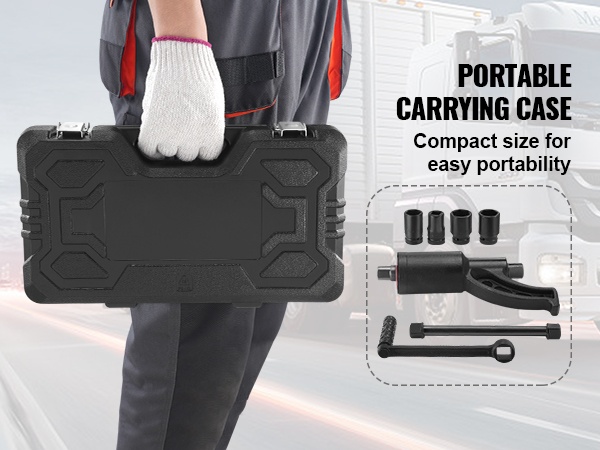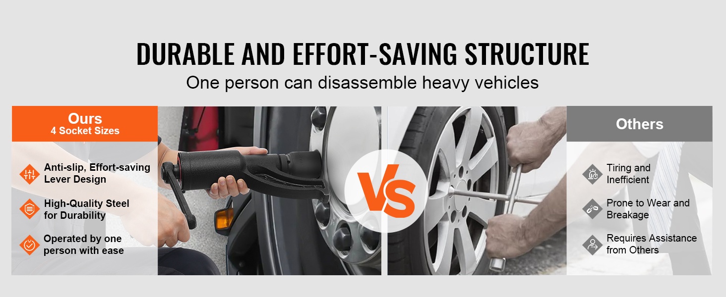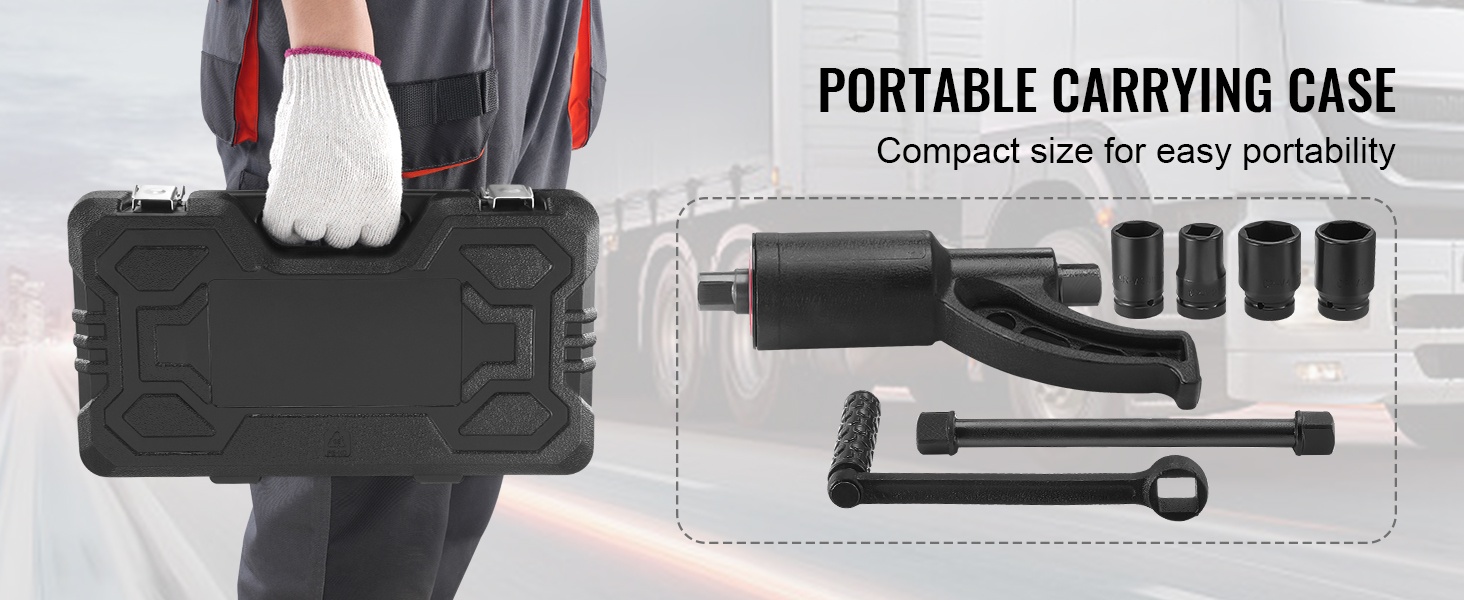 1:64-välityssuhteella jopa 6800 N·m lähtömomentti, kestävä seosteteräsrakenne, pitkä vipu, liukumatonta otetta tarjoava kahva ja kevyt säilytyslaatikko raskaisiin ajoneuvoihin, helppokäyttöinen, toimitus 8 hylsyllä.