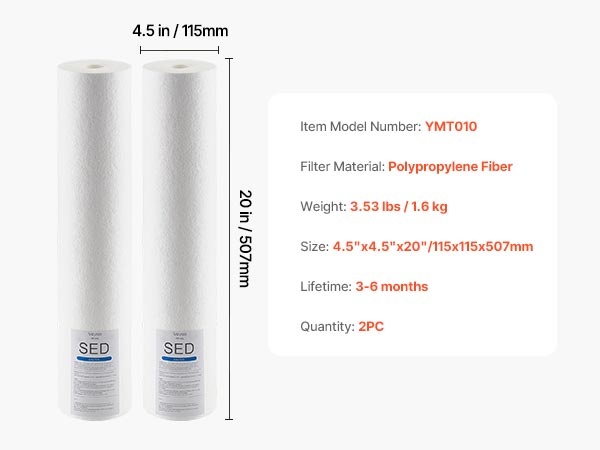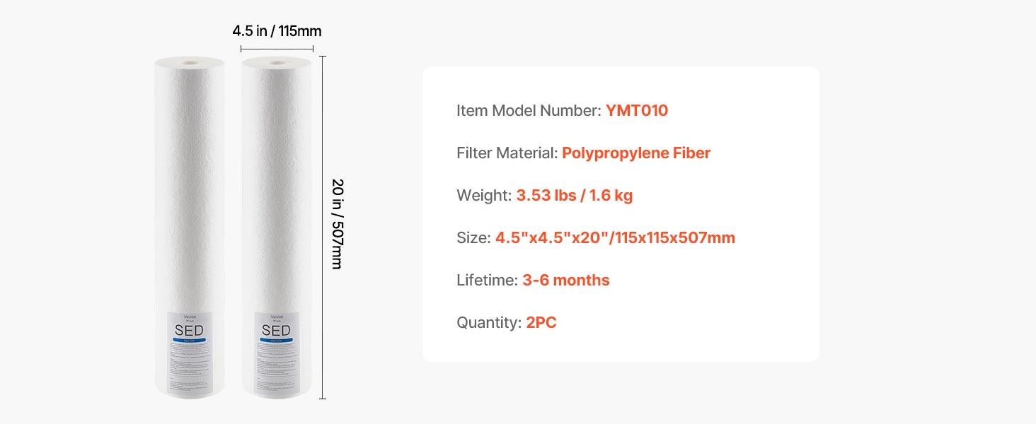 - Vakio 4.5" x 20" (11x51cm) koko ja suuri virtauskapasiteetti, yhteensopiva useimpien suodatinkoteloiden ja koko talon vesisuodatinjärjestelmien kanssa.