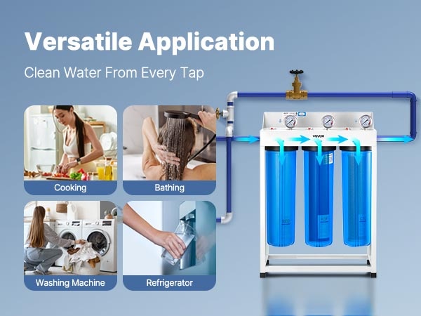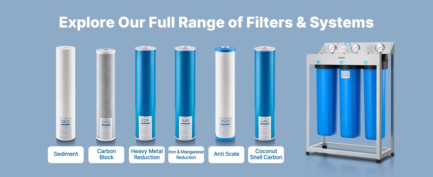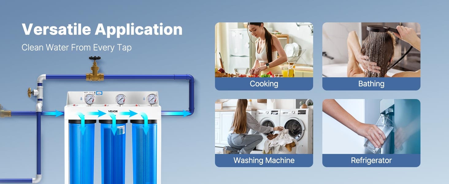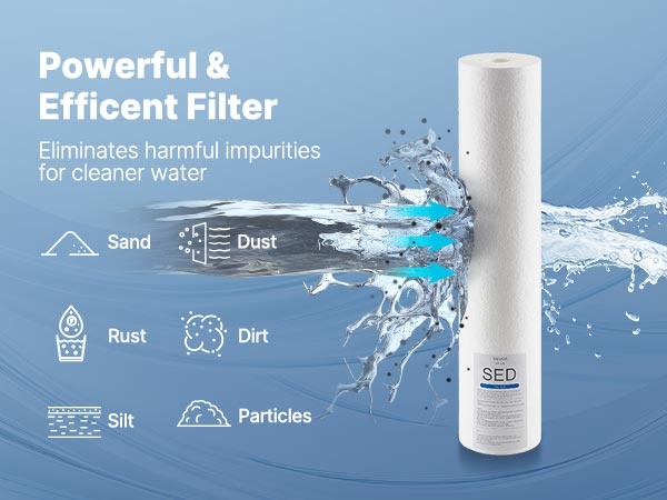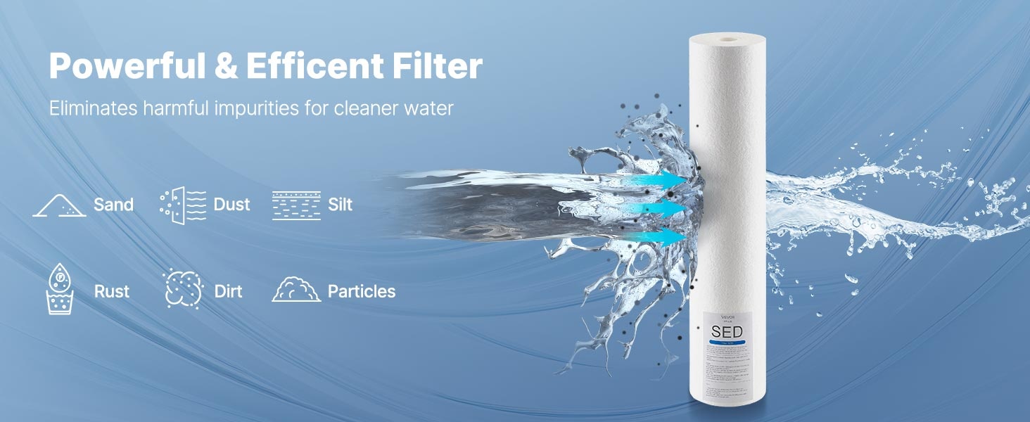 Vakio 4.5" x 20" -kokonsa ansiosta suodatin sopii useisiin yleisiin koko talon vesisuodatinjärjestelmiin, ja sen suuri virtauskapasiteetti mahdollistaa tasaisen vedenkulun koko talossa. Jopa 100,000 gallonan suodatuskapasiteetti ja jopa 12 Months käyttöikä tekevät siitä pitkäikäisen ratkaisun.