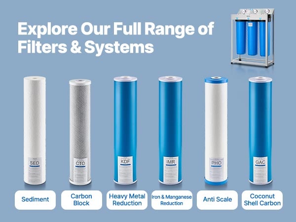 Vaihtosuodatin koko talon vesisuodatinjärjestelmään, jossa käytetään kookospohjaista rakeista aktiivihiiltä ja KDF-suodatinta. Suunniteltu vähentämään raskasmetalleja, klooria, makua ja hajua koko kodin vesijärjestelmässä.