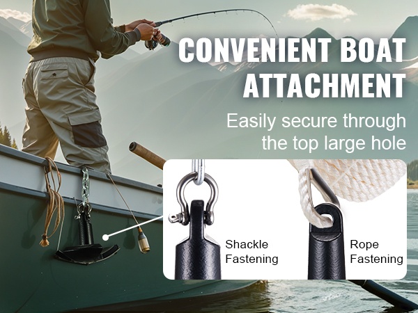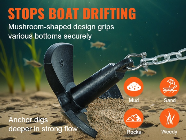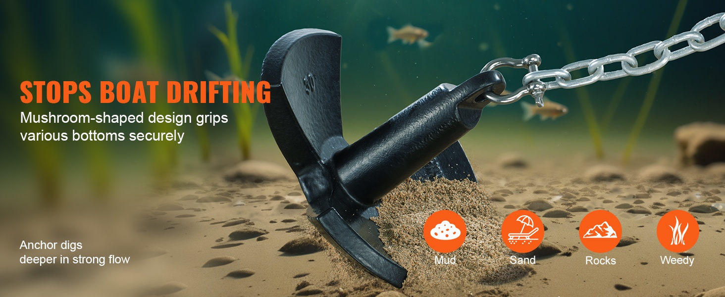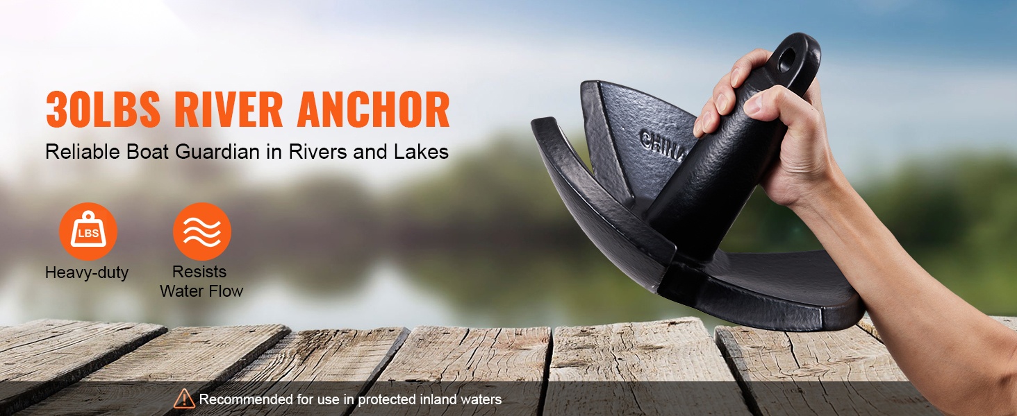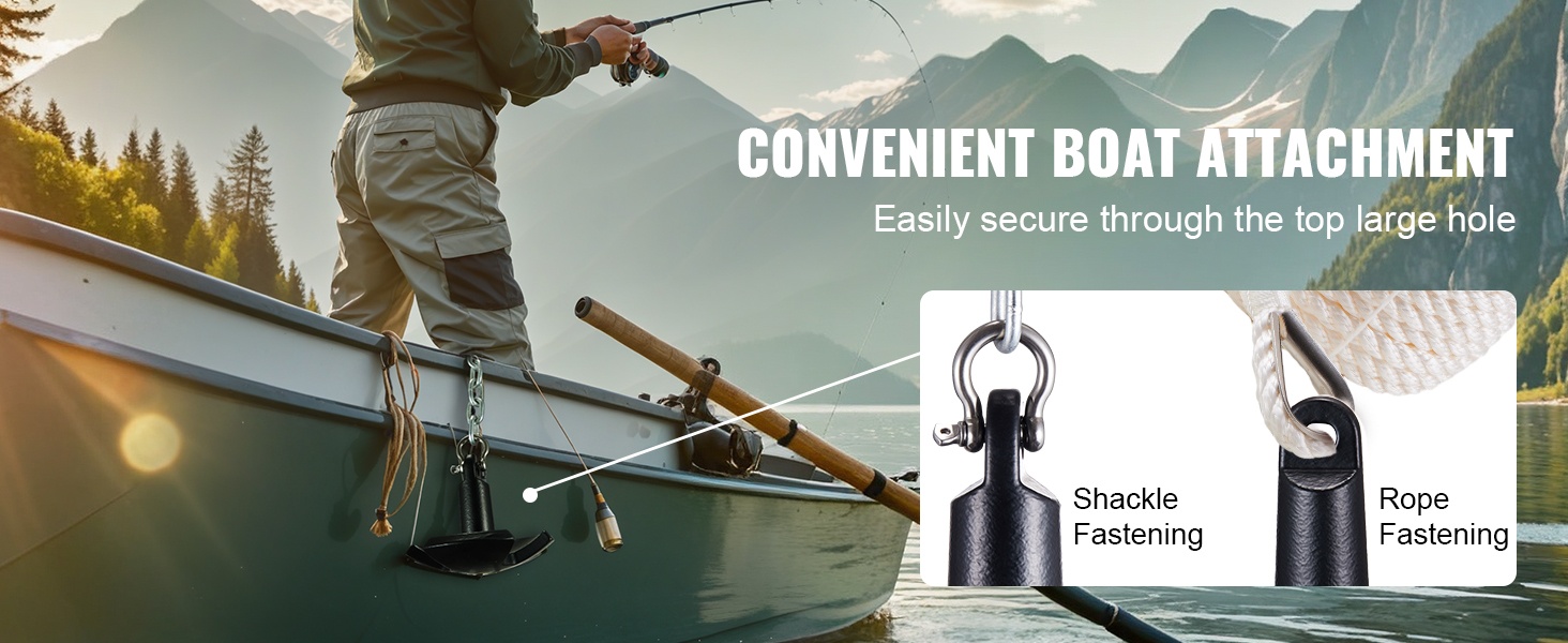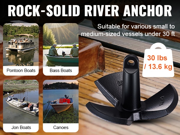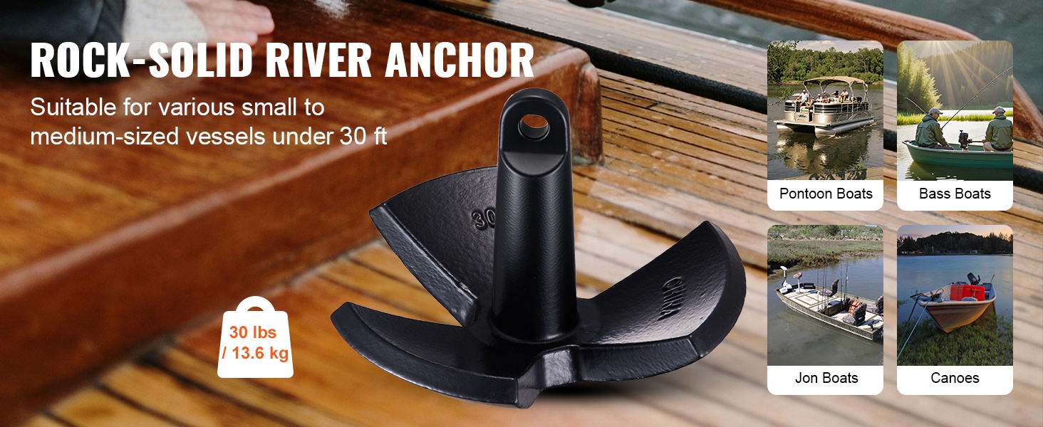 Tämä raskas ankkuri soveltuu useille venetyypeille, kuten pienille ponttooniveneille, kalastusveneille, Jon-veneille, kanooteille ja kajakeille aina 30 ft pituuteen asti. Paino auttaa minimoimaan ankkurin liukumisen virtauksessa tai tuulessa.