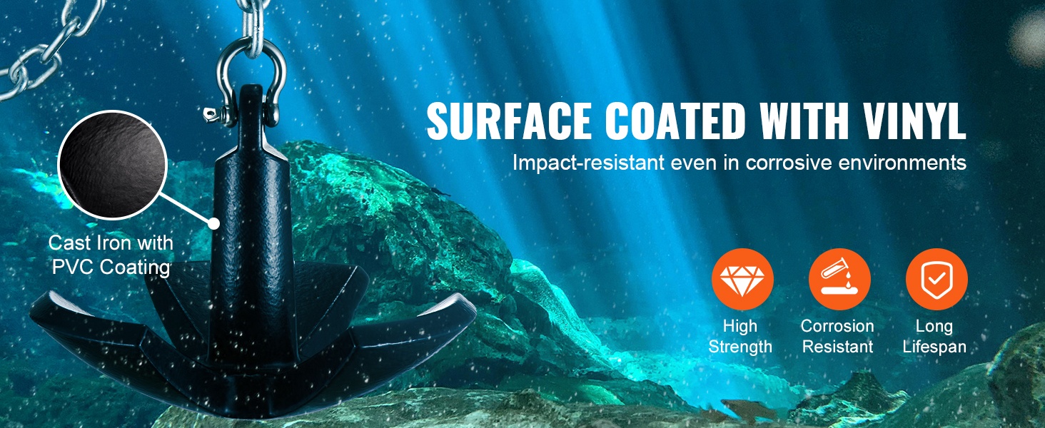 Ankkuri on valmistettu valuraudasta (HT200) ja päällystetty vinyylillä. Rakenne kestää iskuja ja vähentää ruostumista jatkuvassa vesikosketuksessa, samalla suojaten veneen runkoa.