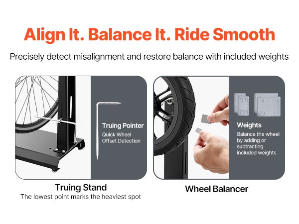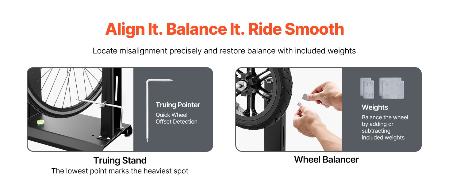 Yhdessä telineessä saat sekä vanteen tasapainotuksen että oikaisun. Joustava osoitin auttaa havaitsemaan heiton, ja herkästi pyörivät laakerit paljastavat, mihin kohtaan vannetta tasapainopainot kannattaa lisätä. Mukana tulevilla 5 g / 10 g painoilla palautat tasapainon, kunnes rengas pysyy paikallaan missä asennossa tahansa.