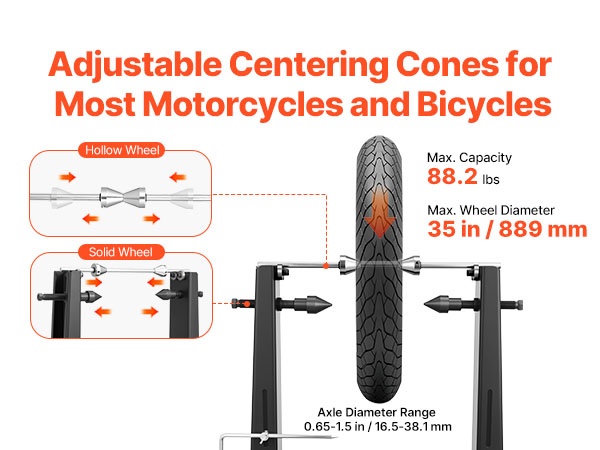 Teline on suunniteltu nykyaikaisille onttoakselisille vanteille. Säädettävät keskityskartiot sopivat useimpiin katu-, matka- ja seikkailumoottoripyöriin sekä moniin polkupyöriin, joten voit käyttää samaa tukea eri ajoneuvojen renkaisiin.