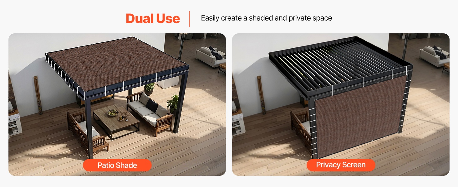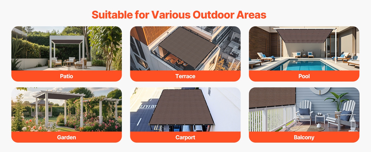 Varjostuskangas soveltuu käytettäväksi terasseilla, pergoloissa, puutarhoissa, uima-altaiden läheisyydessä, autokatoksissa ja parvekkeilla. Se auttaa vähentämään suoraa auringonpaistetta ja lisää ulkotilan käyttömukavuutta.