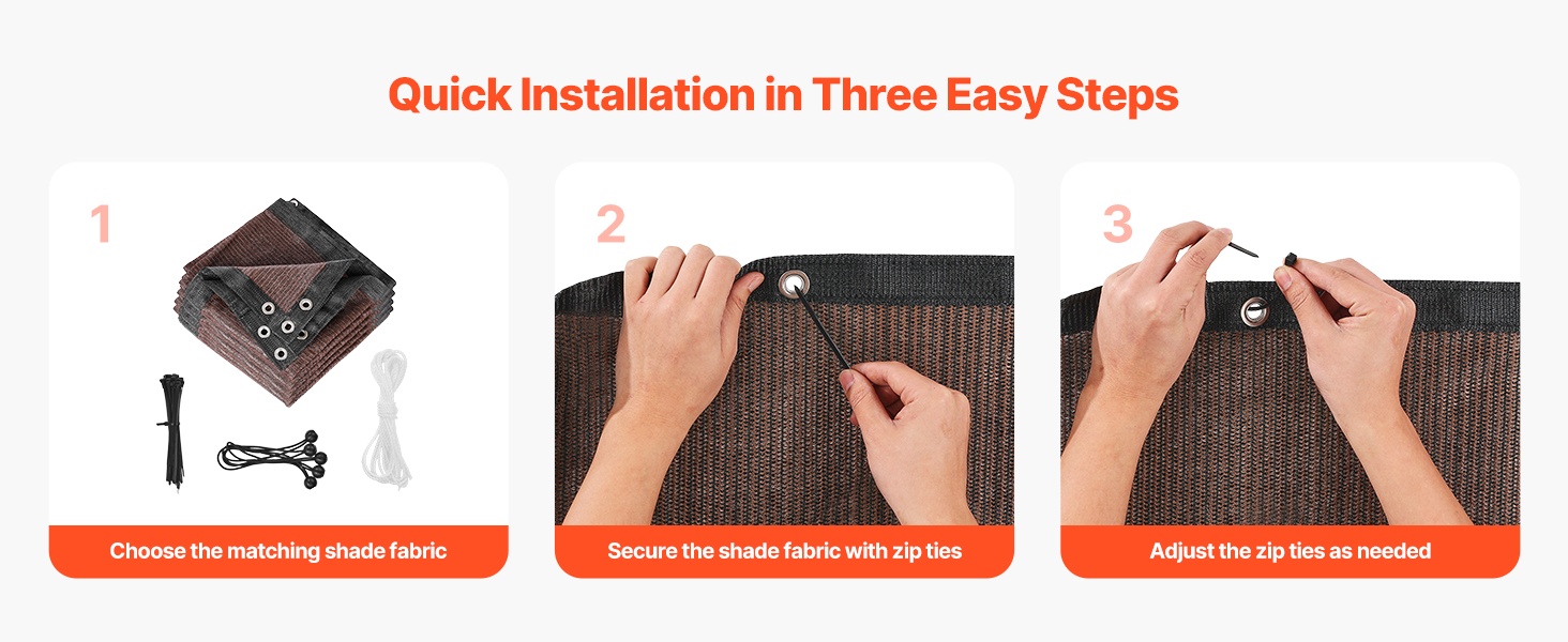 Paketissa on mukana ruostumattomasta teräksestä valmistetut purjerenkaat, 30 mustaa nippusidettä, 5 joustopalloa ja 4 nailonköyttä. Näiden avulla kankaan voi kiinnittää nopeasti esimerkiksi pergolan runkoon, aitaan tai kaiteisiin. Voit valita kohteeseesi parhaiten sopivan kiinnitystavan.