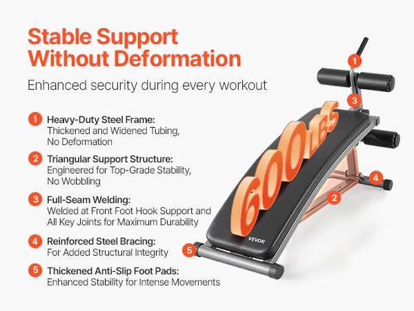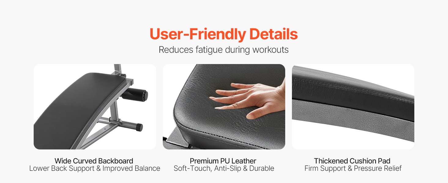 Leveä, kaareva selkänoja tukee lannerankaa ja mahdollistaa laajemman liikeradan vatsalihasliikkeissä. Paksu ja pehmeä istuin- ja selkäpehmuste vaimentaa painetta, hylkii hikeä ja vähentää lipsumista, mikä tekee treenistä miellyttävämmän ja auttaa vähentämään lihasväsymystä.
