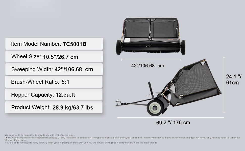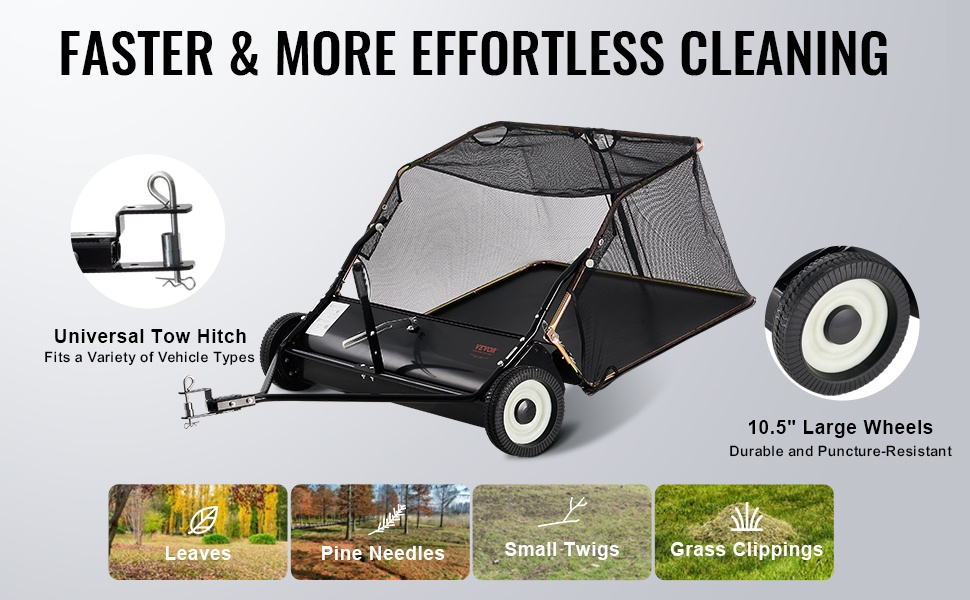 Yleismallinen vetolaite sopii useisiin ajoneuvoihin. Suuret 10.5" renkaat ovat kestävät ja pistonkestävät, joten laitetta on helppo vetää erilaisilla alustoilla. Vankat PP-harjakset pyyhkivät roskat tehokkaasti, mikä nopeuttaa työn valmistumista.