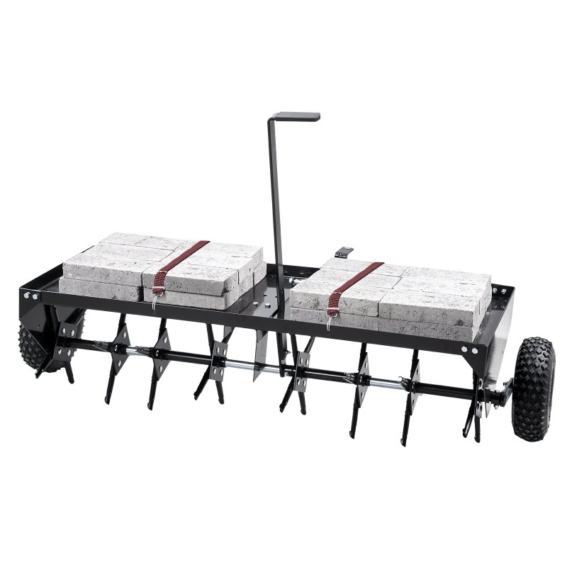Laaja 48 inch / 1219.2 mm ilmastusleveys ja tasainen piikkien sijoittelu mahdollistavat suurten alueiden käsittelyn nopeasti. Ilmastin on suunniteltu vedettäväksi ajettavan laitteen perässä, jolloin nurmikon hoito sujuu vaivatta myös toistuvassa käytössä.