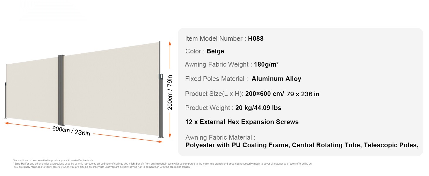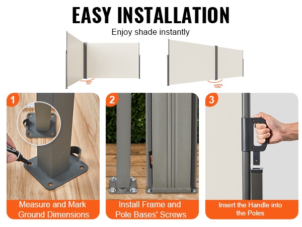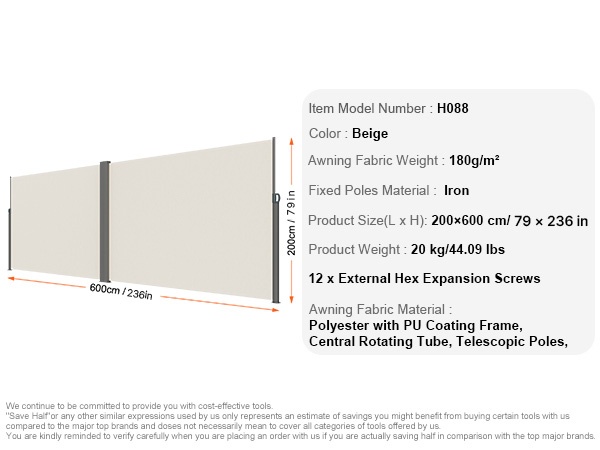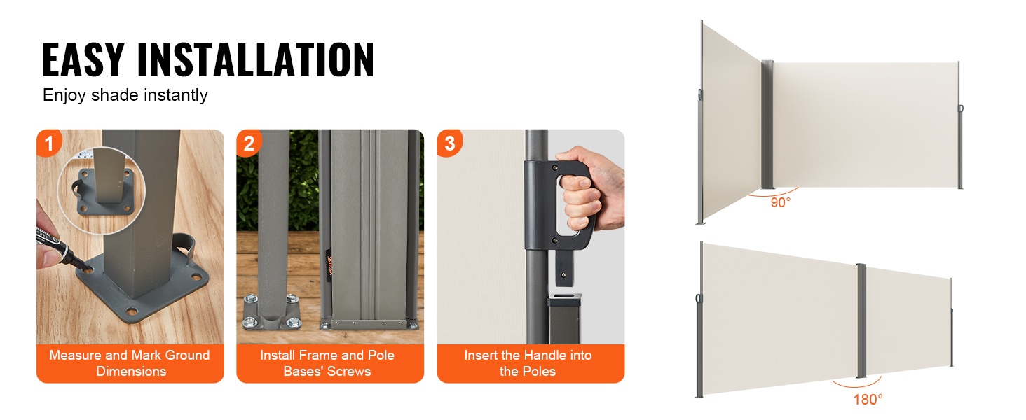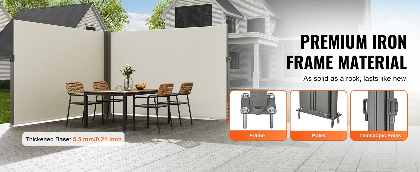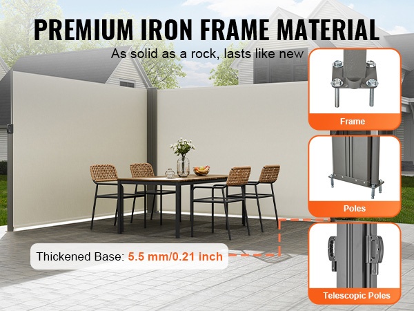 Vedettävän sivuverhon rakenne on valmistettu korkealujuuksisesta raudasta, ja jauhemaalaus viimeistelee ulkonäön sekä suojaa korroosiolta. Metalliset laajennusruuvit parantavat vakautta, jotta markiisi pysyy lujasti paikoillaan ulkona.