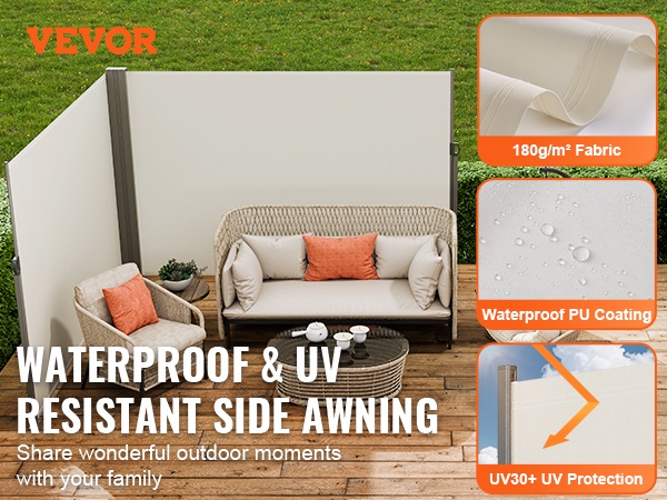 Korkeatiheyksinen 180g/m² polyesterikangas ja vahva PU-pinnoite tarjoavat hyvän vedenpitävyyden ja kestävyyden. UV30+ -suojaluokka auttaa pitämään sinut ja perheesi poissa haitallisilta UV-säteiltä, joten ulkona voi oleskella huolettomammin.